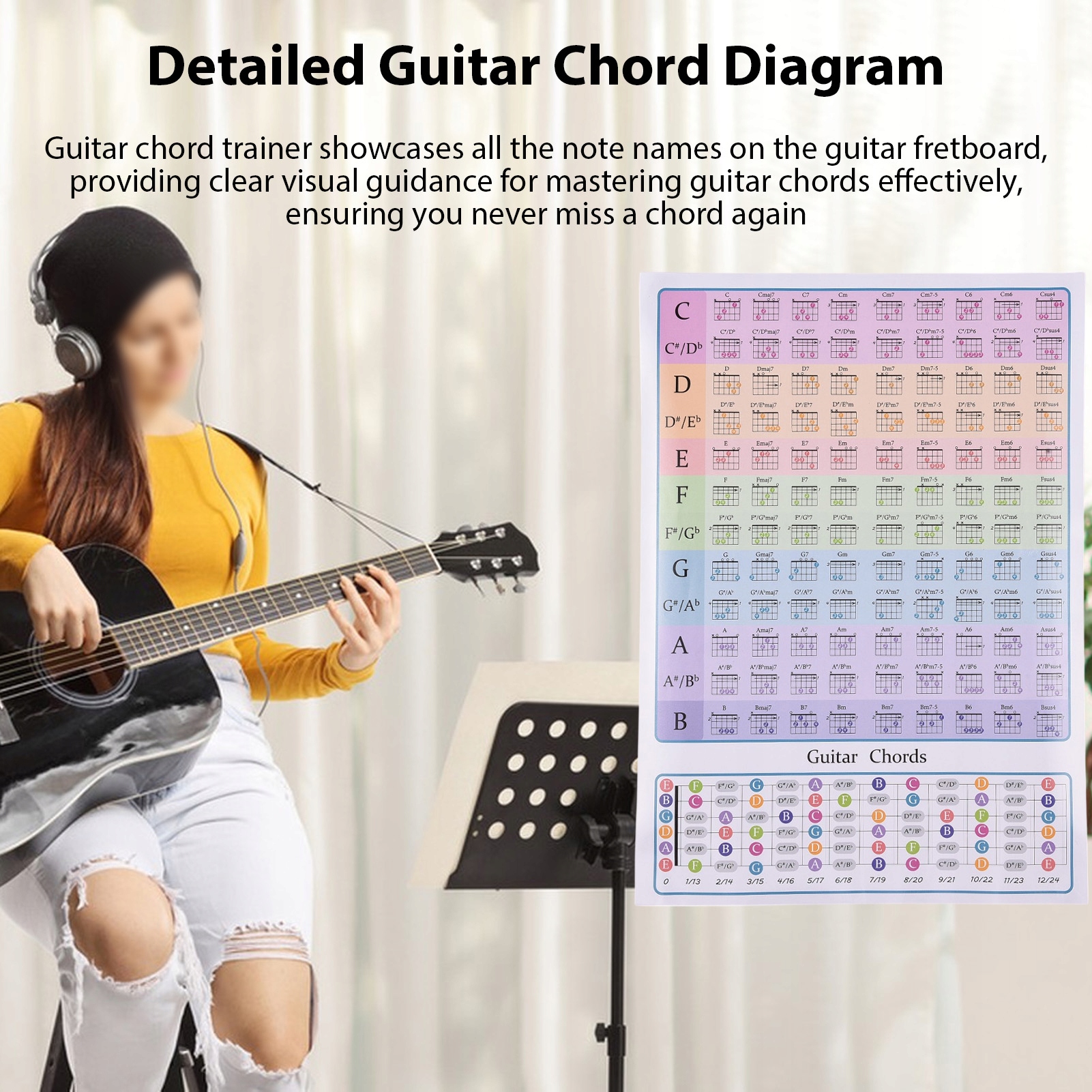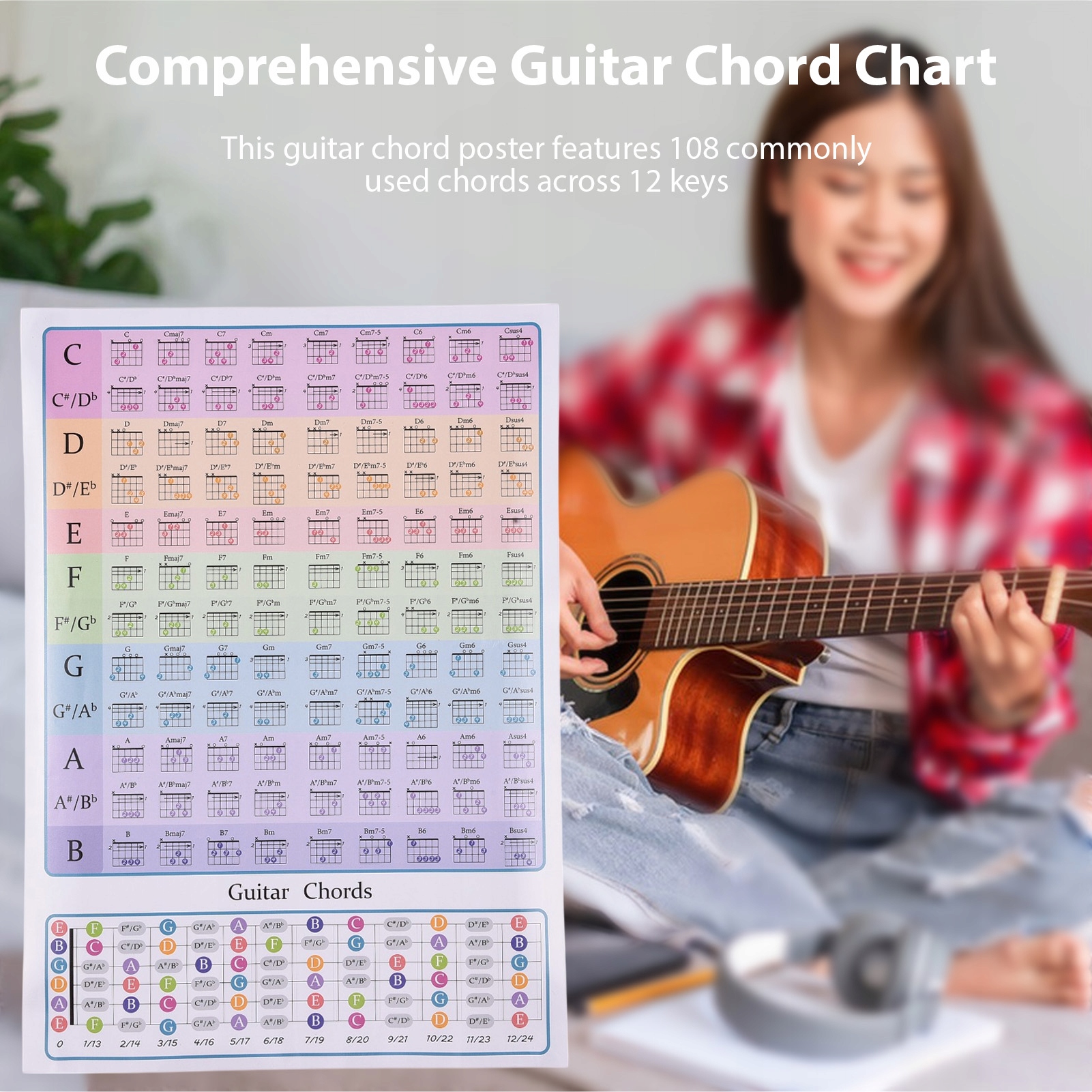 1. Комплексная диаграмма гитарных аккордов: этот плакат гитарного аккорда содержит 108, обычно используемые аккорды на 12 ключах, что делает его незаменимым ресурсом как для начинающих гитары, так и для опытных игроков, которые хотят улучшить свои навыки благодаря графику гитарных хордов.