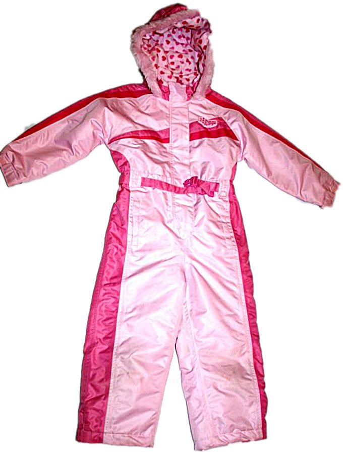 Красивый лыжный костюм с капюшоном от известной фирмы. Изготовлен из водонепроницаемого, дышащего материала. Все розовое с более темными вставками. Капюшон на флисовой подкладке с розовыми сердечками, полностью на подкладке, дополнительная светоизоляция. Костюм застегивается на молнию и липучку, пояс на талии, рукава на липучке, на штанинах резинки.