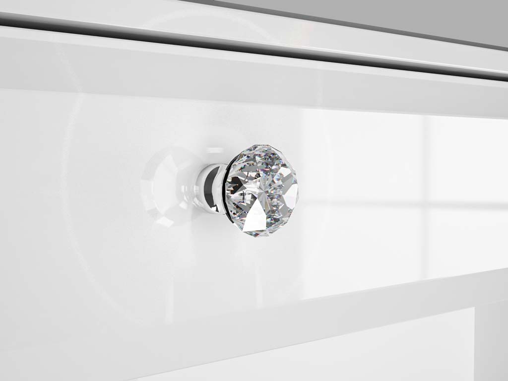 Плюковой столик отличается округлыми фронтами MDF в белом глянце и матовом корпусе, что придает ему современный и элегантный вид. Зеркальный плинтус, отражающий окружающее пространство, добавляет легкость и оптически увеличивает интерьер. Элемтный ящик с полным расширением и армированным дном, а также хромированные ручки, украшенные имитационным бриллиантом, увеличивают как эстетику, так и функциональность мебели. Дополнительное дополнительное светодиодное освещение, доступное в предложении, позволяет вам создать капризную атмосферу, идеально подходящую для ритуалов ежедневного ухода.
