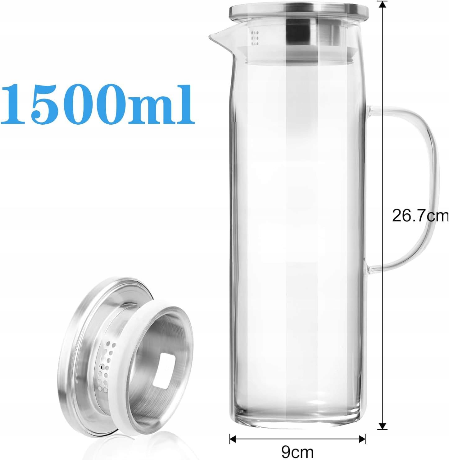 Стеклянный графин для воды на 1,5 литра, что соответствует 5–6 чашкам вода. Идеально подходит для чая, сока, молока, вина, кофе, коктейлей и т. д. Практичный и красивый стеклянный графин может удовлетворить повседневные потребности вашей семьи.
