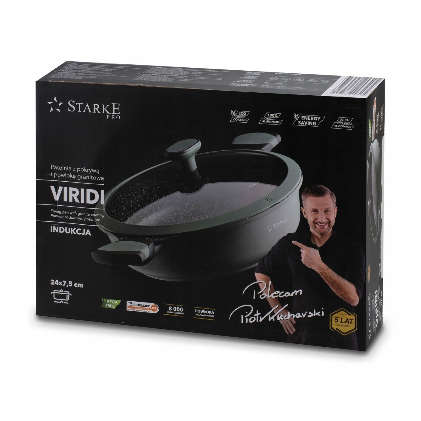 Мраморная индукционная сковорода Starke Pro Viridi диаметром 24 см с 2 короткими ручками и крышкой изготовлена из алюминия. Для его создания использовалась технология гомогенного литья под давлением. Благодаря этому он идеально сбалансирован и очень прочен с точки зрения механических и термических свойств. Повышенную долговечность обеспечивает также термостойкая силиконовая краска, покрывающая внешнюю поверхность корпуса. Внутренняя часть сковороды отделана покрытием GREBLON C3 MARBLE, обогащенным гранитными частицами. Его высокое качество, отличная адгезия, твердость и трехслойная структура разработаны немецкой компанией WEILBURGER. Он также имеет маркировку PFOA Free. Энергоэффективность обеспечивается индукционным дном толщиной 4,5 мм. Благодаря этому мраморную сковороду Viridi размером 24 х 7,5 см можно использовать на любой плите. Антипригарное покрытие также позволяет жарить с небольшим количеством жира и упрощает уход. Он выдерживает до 8000 циклов истирания, что в четыре раза больше, чем у обычных мраморных сковородок с антипригарным покрытием, доступных на рынке. Крышка с силиконовой кромкой и незаметная система регулирования количества пара внутри сосуда позволяют тушить ингредиенты. Переносить и использовать модель облегчают мягкие на ощупь ручки, которые не нагреваются и не выскальзывают из рук. С его помощью вы можете создать свой собственный набор кухонной посуды Viridi — для домашнего использования ее рекомендует Петр Кучарский, лично проверивший ее возможности и качество. Гарантия на товар составляет 5 лет.