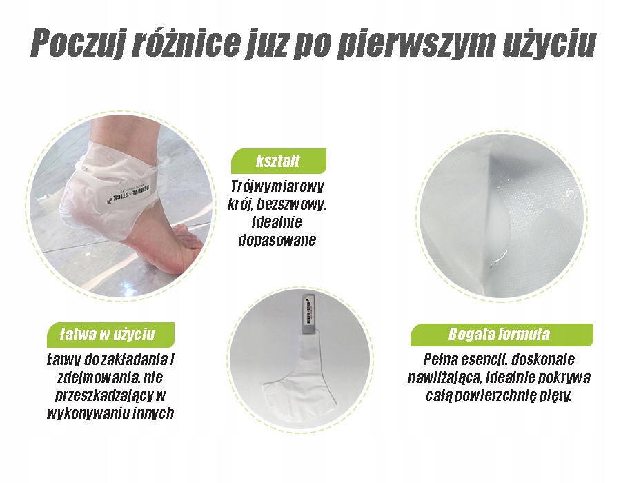 они увлажняют и сглаживают и смягчают твердую кожу каблуков. Аргановые и кокосовые масла восстанавливают функции кожи, придают ему мягкость и эластичность. Они питают, гладкие и помогают поддерживать правильную увлажнение кожи. Ниацинамид, содержащийся в масках, имеет сглаживание свойства и улучшает кровоснабжение кожи. Масло ши помогает восстановить защитный гидролипидный слой эпидермиса, благодаря которому он предотвращает сбежать и высушивание влаги и сушки кожи. Благодаря высокому содержанию токоферола (витамин Е), он обладает увлажняющим, успокаивающим и защитным эффектом.