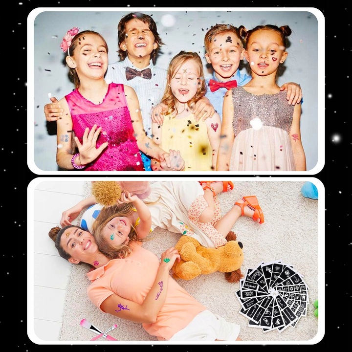 ✔️Многократное использование✔️Благодаря большому количеству трафаретов и блесток можно создавать множество разных татуировок. Набора хватит на множество увлекательных сеансов создания татуировок.