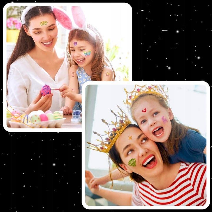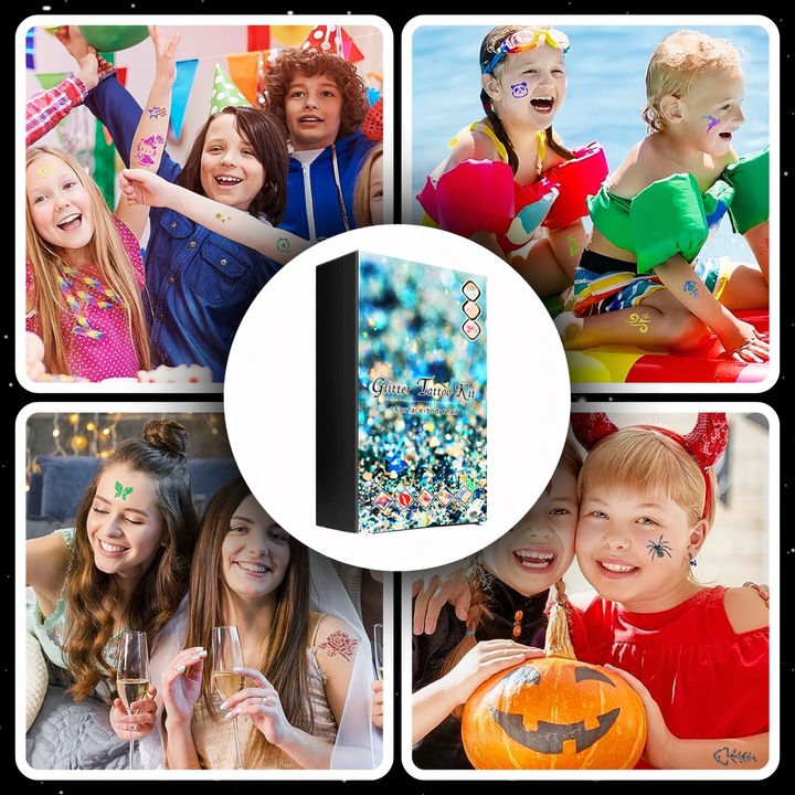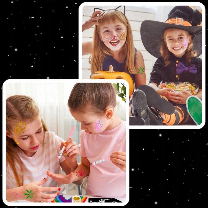 ✅Легко делать татуировки: процесс создания татуировок прост и приятен. Просто снимите трафарет, нанесите клей, подождите немного и добавьте блесток. Эффект мгновенный и впечатляющий.