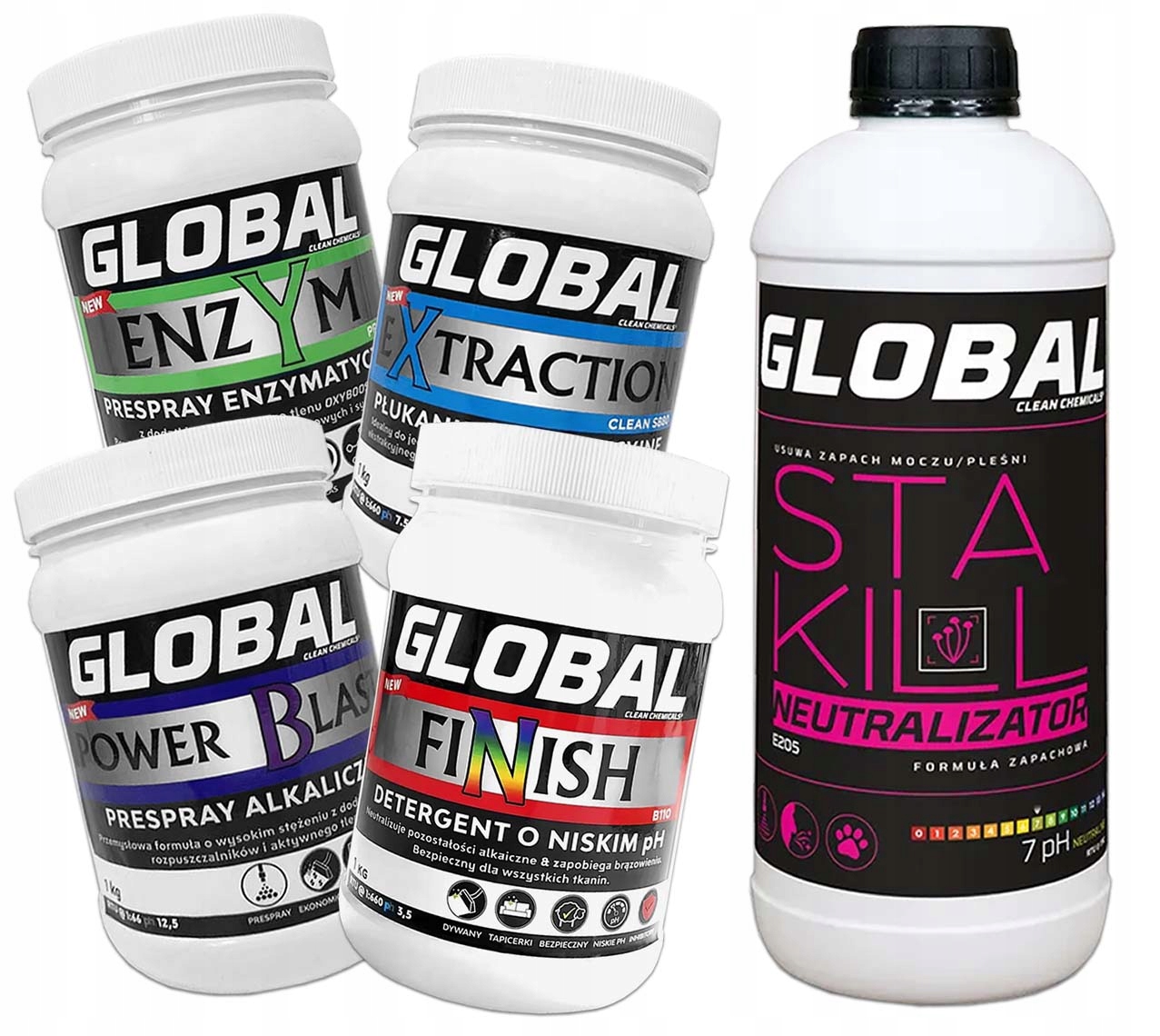 Набор Global является комплексным решением для профессионалов, занимающихся чистящими коврами, обивкой и напольными покрытиями. Он включает средства для начального растворения грязи, промывки экстракции и нейтрализации ароматов, которые гарантируют эффективные и безопасные результаты. Идеально подходит для промышленного и коммерческого применения