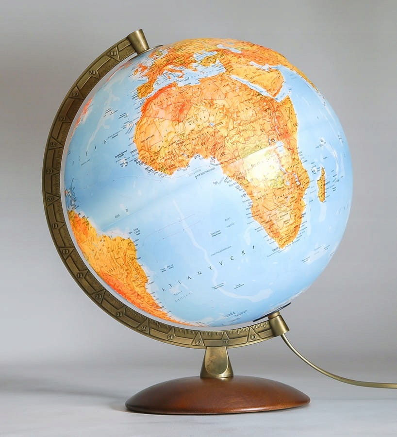 Пластмассовый глобус с подсветкой Primus Relief установлен на деревянной основе и закреплен на металлическом меридиане. Карта на польском языке. Размер мяча 30 см, высота 38 см. Простая замена лампочки.