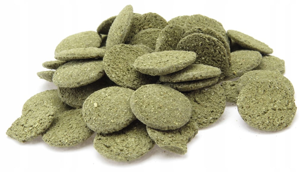 Экструдированный корм в виде тонущих вафель с добавлением морских водорослей Спирулина и растительных ингредиентов.