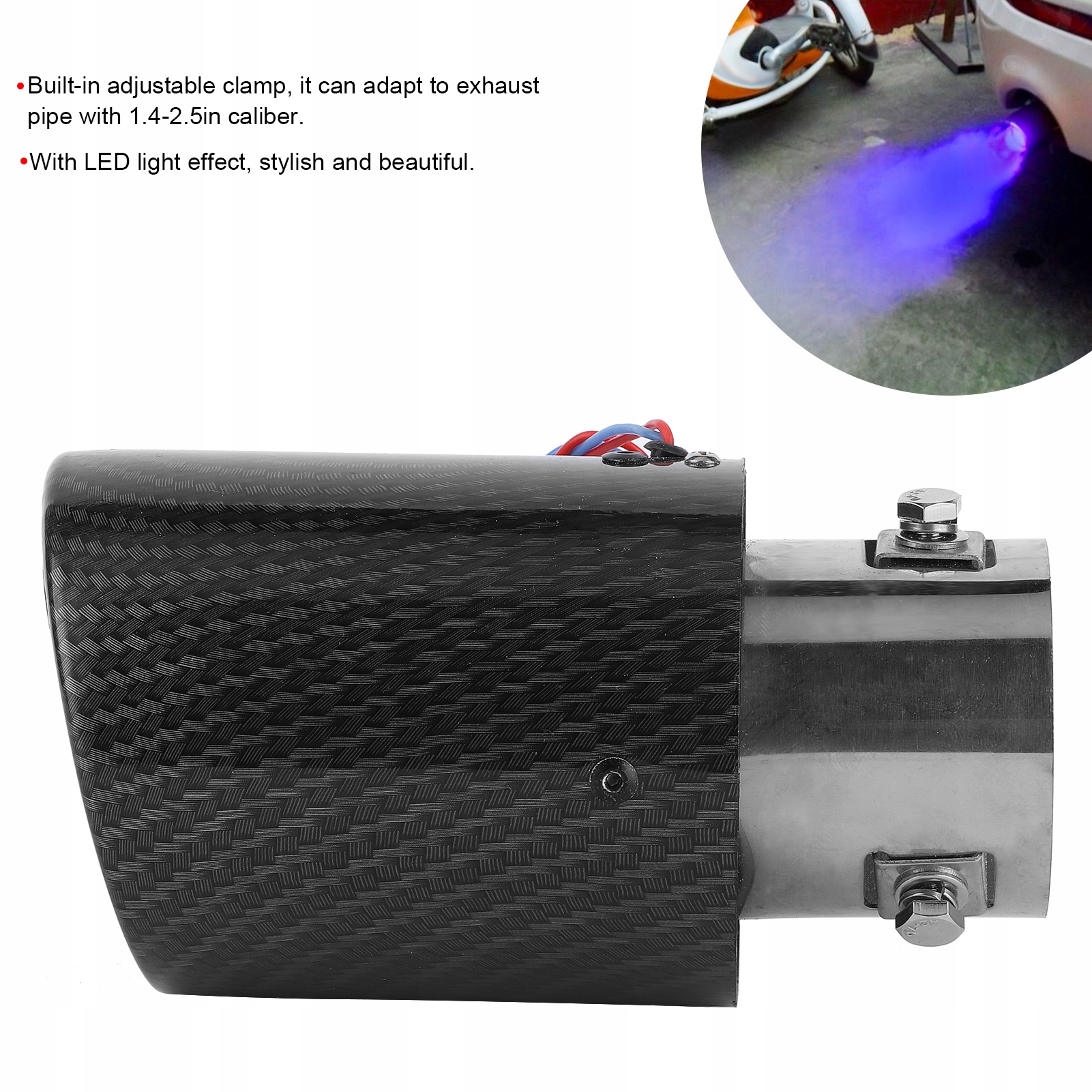 2. Встроенный регулируемый зажим подходит для выхлопной трубы калибра 1,4–2,5 дюйма.