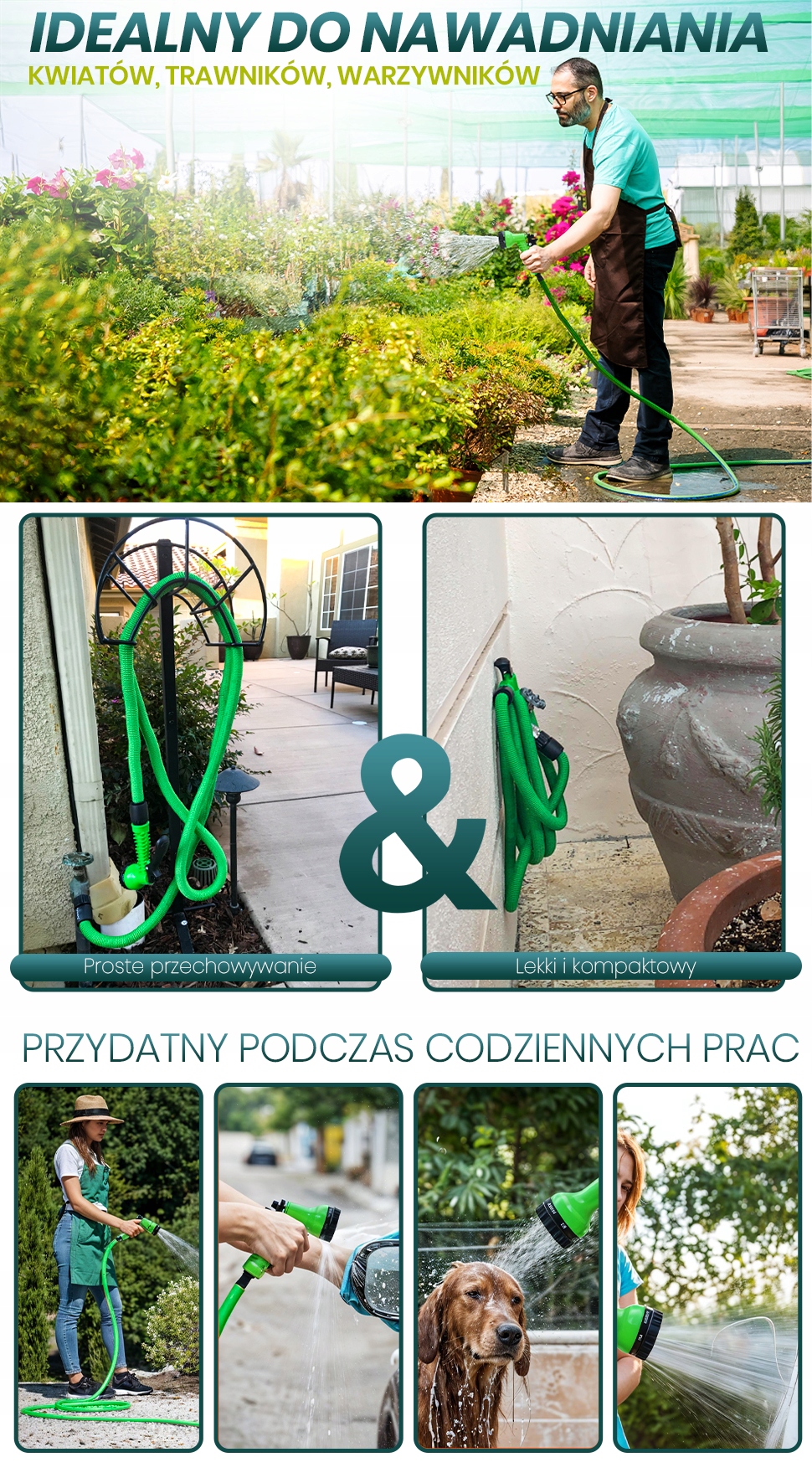 Гибкий, растягивающийся шланг длиной от 10 до 30 метров, это полезная вещь во многих ситуациях, особенно в саду или при работе по дому. Шланг изготовлен из прочного материала, устойчивого к механическим повреждениям и погодным условиям, что обеспечивает длительное использование. Его главной особенностью является гибкость, поэтому его можно легко растянуть до нужной длины при использовании и свернуть по окончании работы, что упрощает хранение. Расширяемый шланг при использовании может растягиваться в три раза своей длины, что позволяет добраться до мест, недоступных для более коротких шлангов. После использования его можно свернуть в компактную форму, что позволяет легко хранить его в ограниченном пространстве. Его можно использовать для полива растений, мытья автомобиля или очистки поверхностей, что делает его универсальным инструментом дома и в саду. Гибкие шланги устойчивы к перекручиванию во время использования, исключают неприятные перегибы и снижают риск образования трещин или повреждений. В комплект со шлангом входит переходник на кран 1/2" и 3/4" для стандартной вставной системы и многофункциональный пистолет с 7 режимами распыления.
