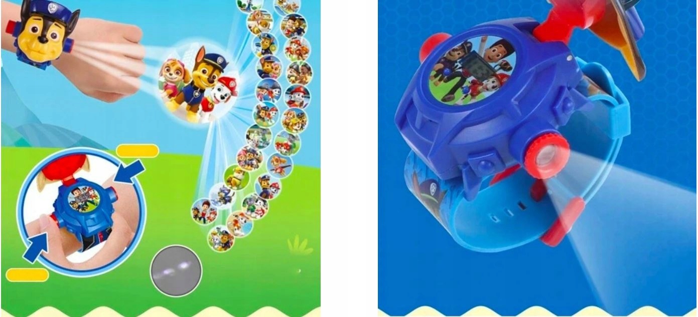 ПОСЛЕ НАЖАТИЯ КНОПКИ С ЛЕВОЙ СТОРОНЫ, СВЕТОДИОД НА ПРАВОЙ СТОРОНЕ ЧАСОВ ЗАГОРАЕТСЯ, ОТОБРАЖАЯ РАЗЛИЧНЫЕ ИЗОБРАЖЕНИЯ И ПЕРСОНАЖЕЙ ИЗ ЩЕНЯЧЕГО ПАТРУЛЯ!