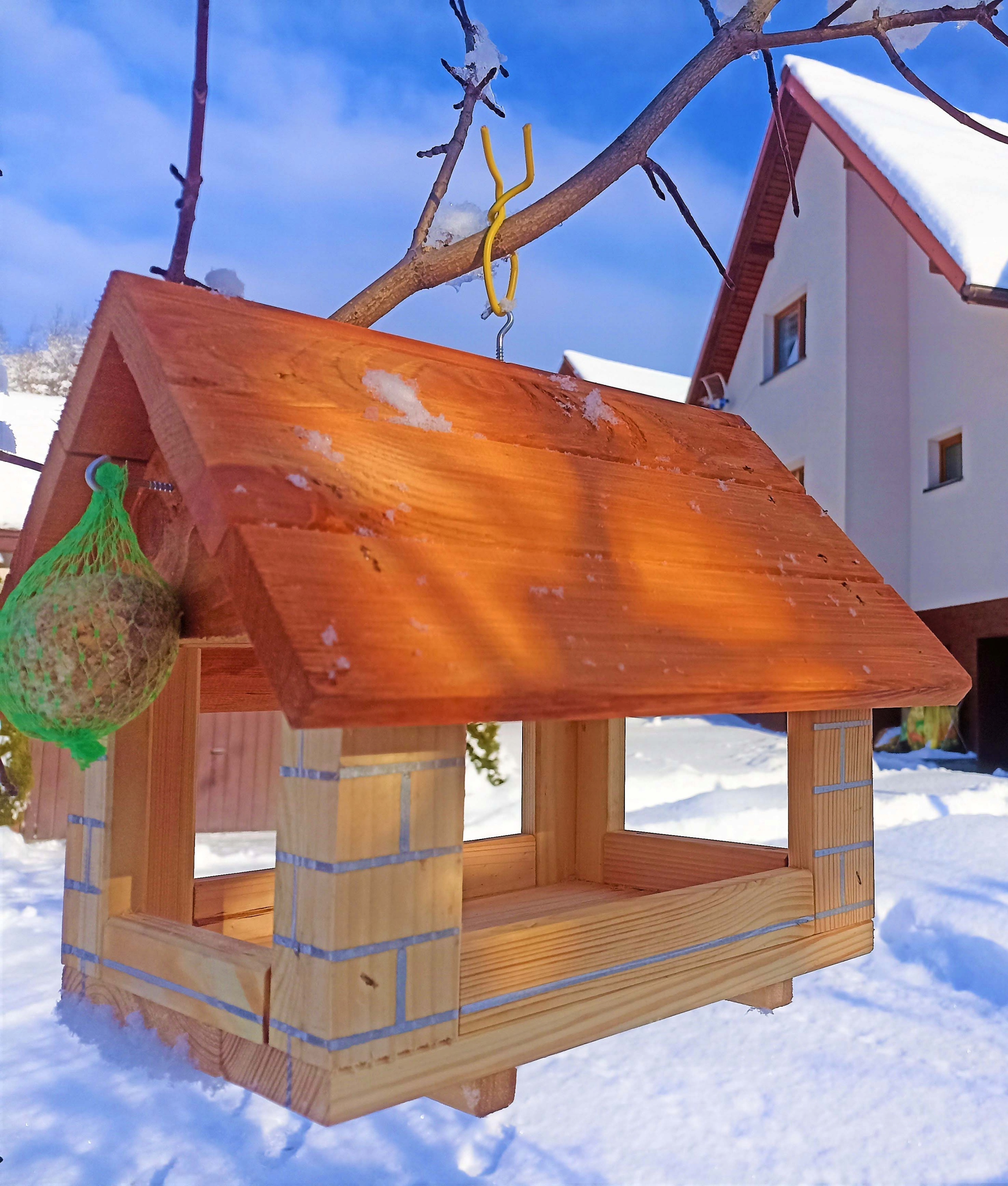 Кормушка выглядит великолепно. Птички с большим удовольствием посещают кормушку, даже если нет снега, прилетают разноцветные птицы и детей невозможно отвлечь от окна.