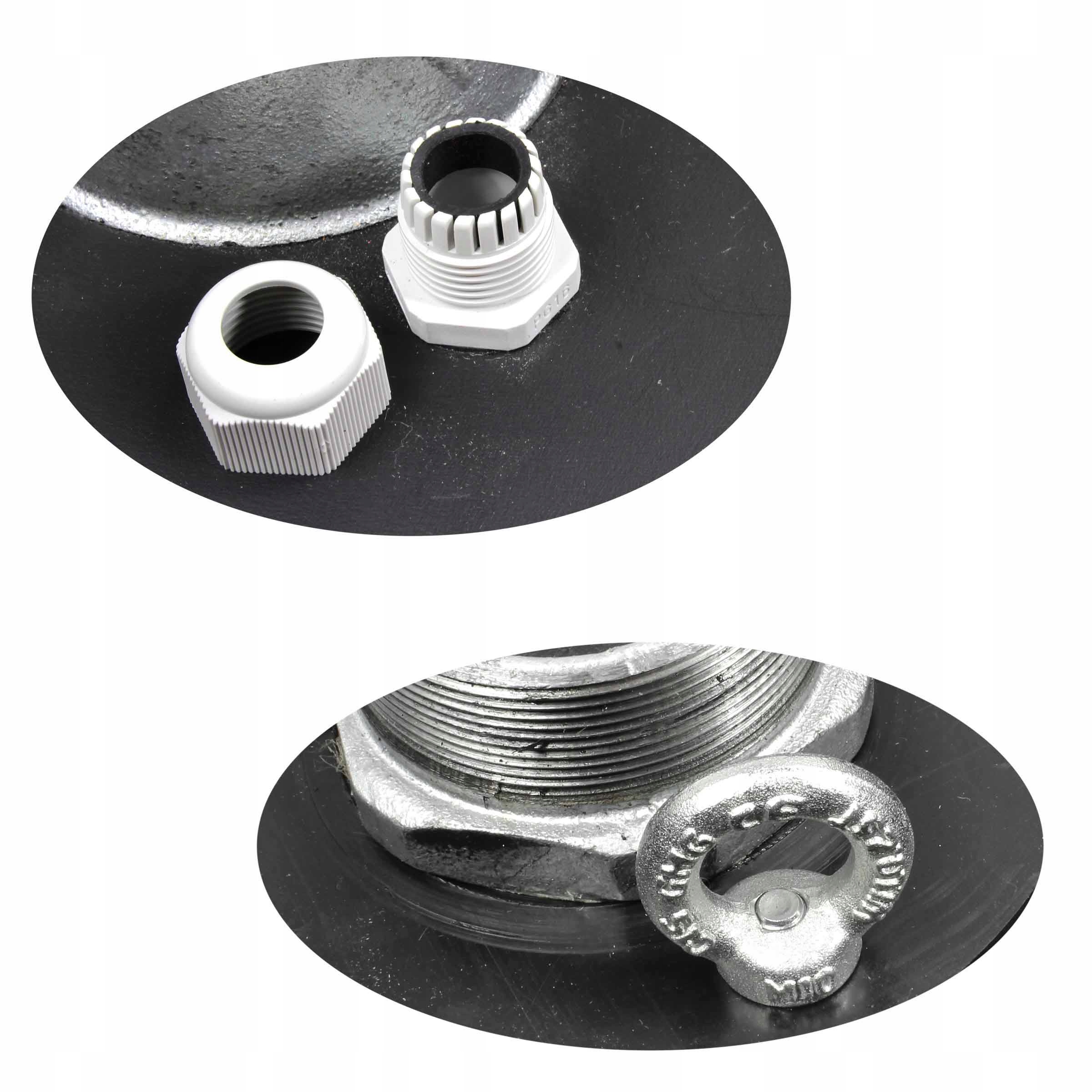 Головка состоит из двух элементов из пластика, винтов для соединения обоих элементов, прокладки, обеспечивающей герметичность колодца. , оцинкованный заглушка с наружной резьбой для крепления насоса, заглушка с внутренней резьбой для подвода напорного патрубка к установке, проушины для крепления кабеля крепления насоса, электрокабельные вводы с обеих сторон крышки.