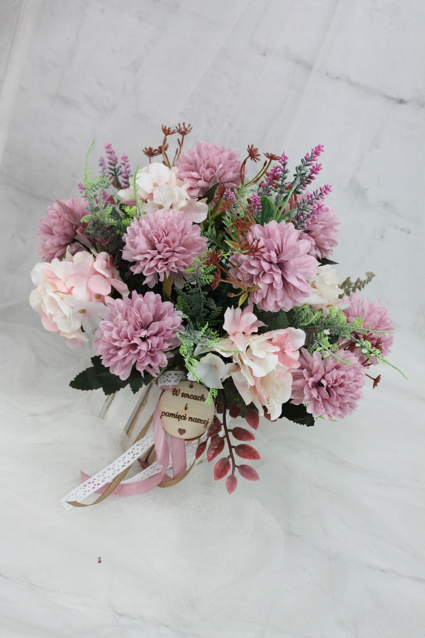 Вся композиция выполнена в пудрово-розовых тонах с добавлением декоративных листьев и травы, идеально соответствующие актуальным тенденциям сезона.