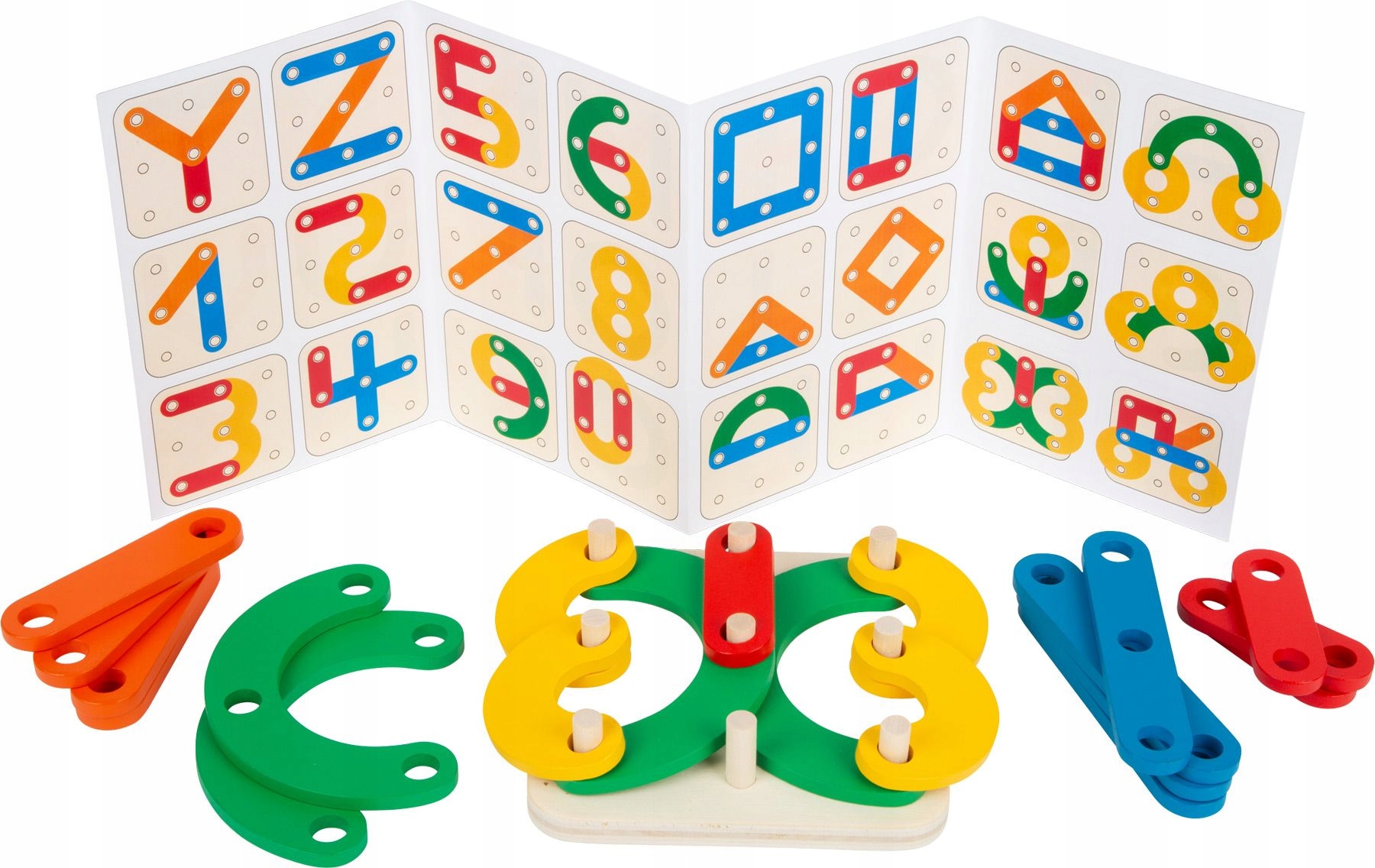 Деревянная шкатулка с раздвижной клапан содержит: квадрат (11 х 11 см) тарелку с 9 палочками, 4 зеленых и 4 желтых полукруглых элемента, 4 продолговатые детали разной длины — темно-синие, оранжевые и красные, а также инструкция в картинках. Задача ребенка — построить на доске буквы, цифры или другие фигуры, используя красочные элементы, имеющиеся в коробке. Вы также можете создавать фигуры по своему воображению.