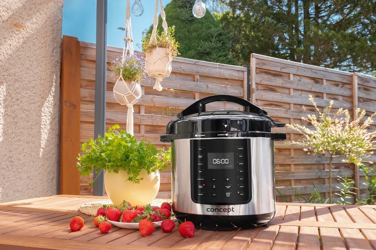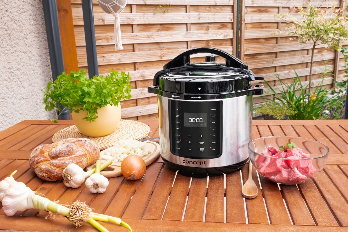 Многофункциональная скороварка Concept CK8001 выполняет функции скороварки, пароварки, мультиварки, кастрюли для консервирования и су-вида, риса и йогурта. Он позволяет подключиться к мобильному приложению Concept Home, где вы найдете 24 предварительно запрограммированные программы. Контролируй его