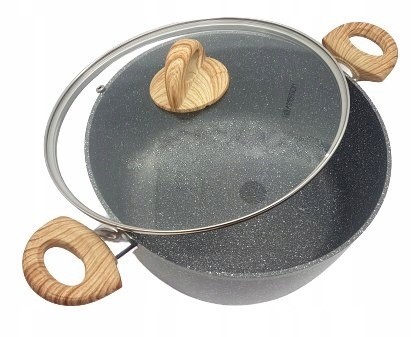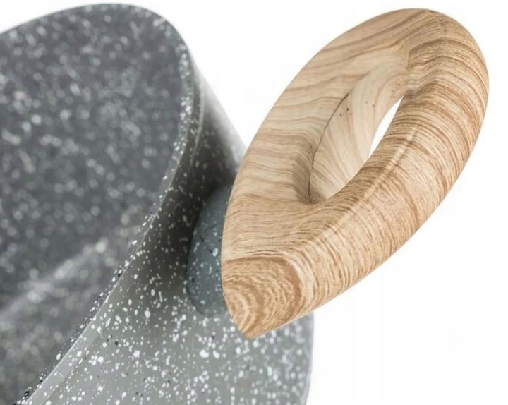 Тело кастрюли своим дизайном напоминает камень, а ручки имитируют дерево.