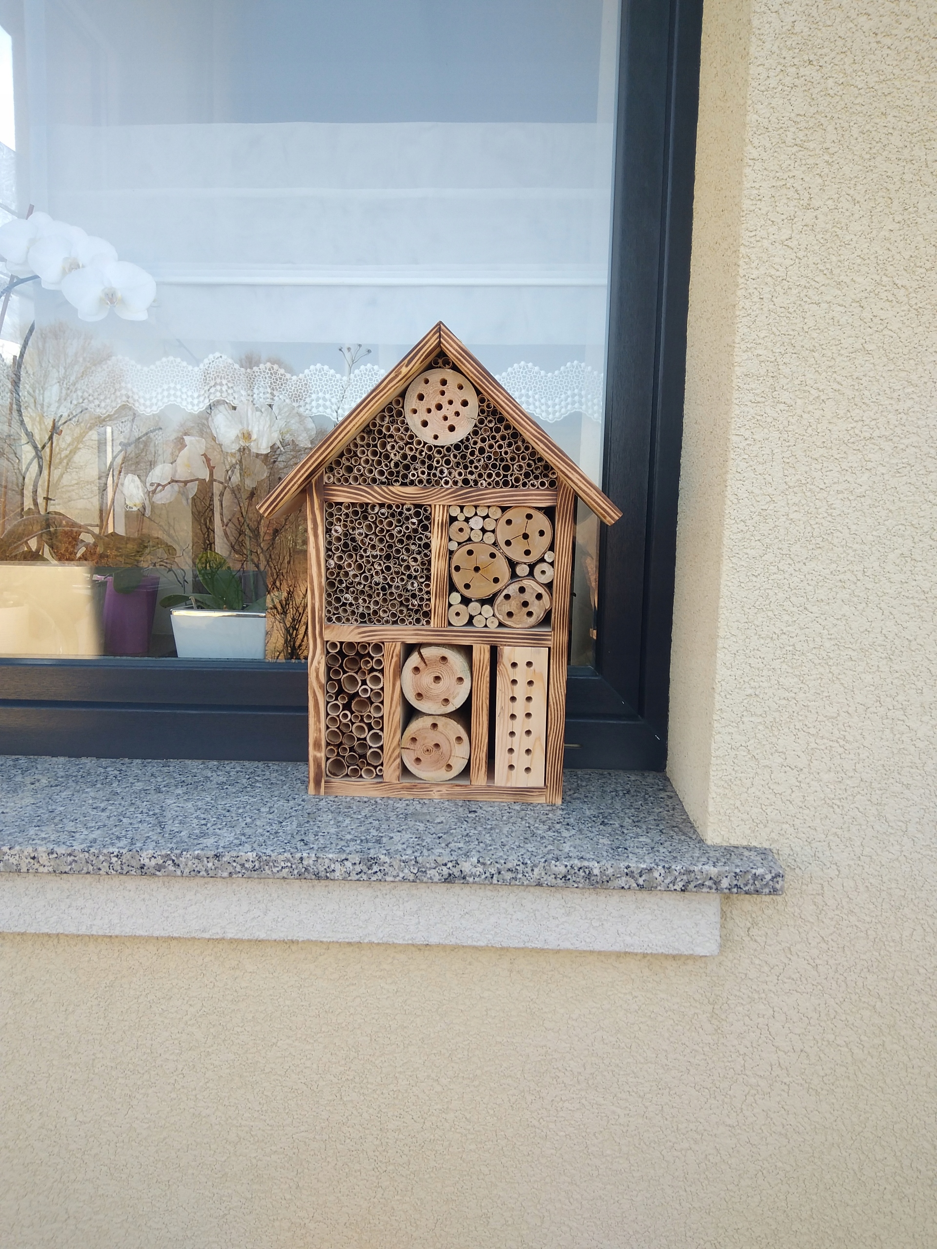 Гостиница для полезных насекомых, красных пчел-каменщиков, скворечник размером примерно 52смх28см (38см с крышей) х 9,5см. Помимо привлечения полезных насекомых и пчел, домик выполняет еще и декоративную функцию. Дома продаются в натуральных цветах, которые можно покрасить по вашему желанию.Дом выполнен из натуральных материалов, которые видны на фотографиях. Из-за используемых натуральных материалов дома могут незначительно отличаться друг от друга. Домик следует поставить/подвесить в защищенном от ветра и дождя месте.