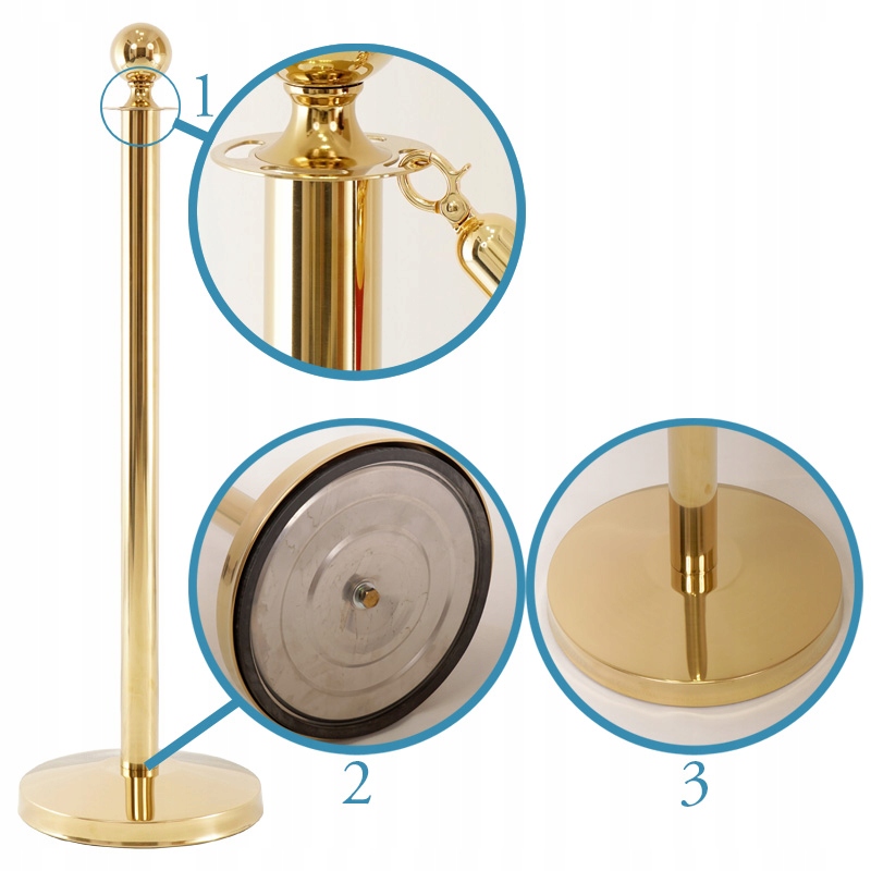 Золотой барьерный столб высотой 97 см изготовлен из стали, что обеспечивает не только его высокую прочность, но и характерный элегантный внешний вид. Благодаря этому их можно с успехом использовать как внутри помещения, так и снаружи. Круглое основание было специально утяжелено, чтобы повысить устойчивость шлагбаума, что снижает риск его опрокидывания или перемещения в случае случайного удара кем-либо из гостей или клиентов. Золотой столб увенчан большим шаром, что придает всему сооружению еще более престижный вид. Золотой отельный столбик будет дополнен веревкой или шнуром соответствующего цвета, который продается в нашем магазине отдельно.