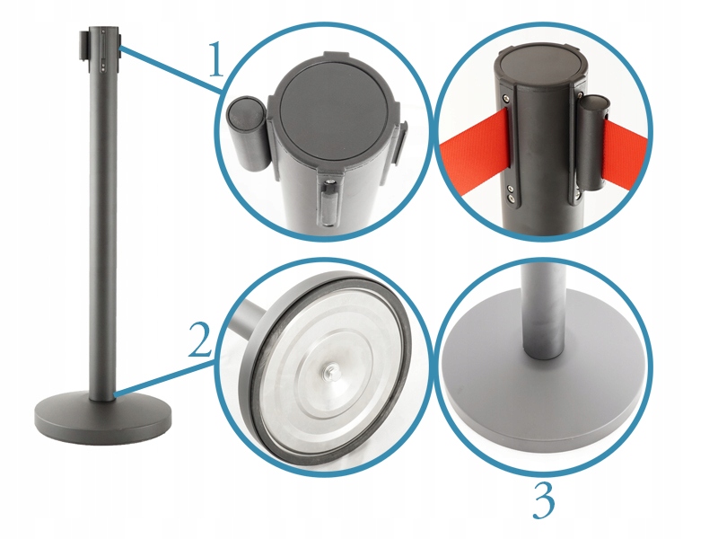 Высота барьерного столба с лентой составляет около 90 см. Специально утяжеленное основание обеспечивает устойчивость, ведь вес всего изделия составляет примерно 8,5 кг. Более того, благодаря защите от скольжения снижается риск случайного смещения или поцарапания пола, на котором он установлен. Красная барьерная лента имеет длину 2,3 м и ширину около 5 сантиметров, а втягивающийся механизм в головке позволяет ее удобно разматывать и втягивать. Крючок на конце ленты позволяет подключить ее к следующему столбу, ведь головка у этой модели трехнаправленная, т.е. помимо механизма размотки она имеет еще 3 ручки в других направлениях. Матовый черный цвет, в который окрашен столбик, придает элегантный вид и прекрасно контрастирует с красной рулонной лентой. Идеально подходит для отелей, ресторанов, магазинов или мероприятий, расположенных вдоль красной дорожки.