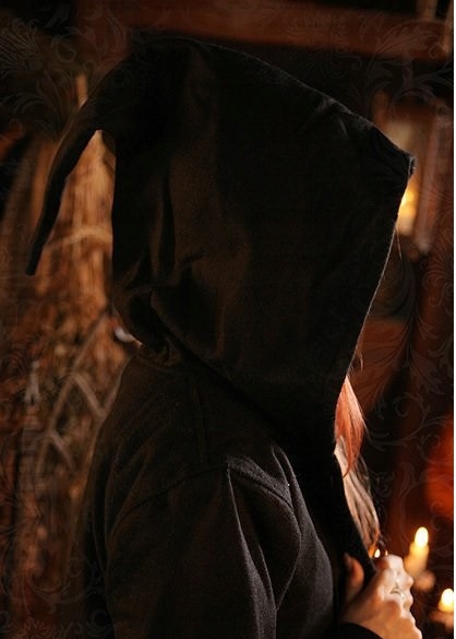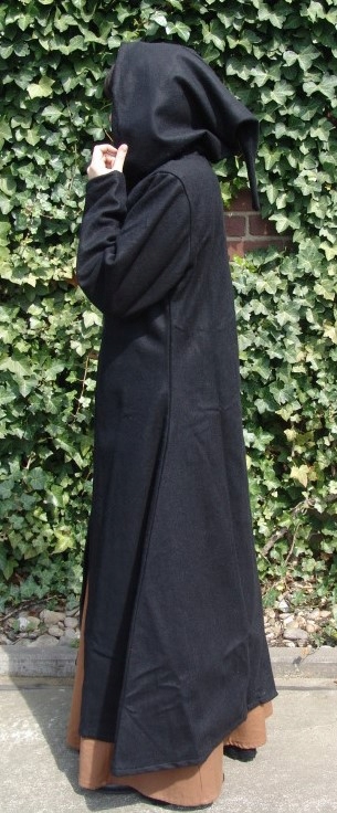 Длинное пальто с капюшоном на подкладке из плотной смесовой шерсти на хлопковой подкладке, застегивается на большие крючки спереди.