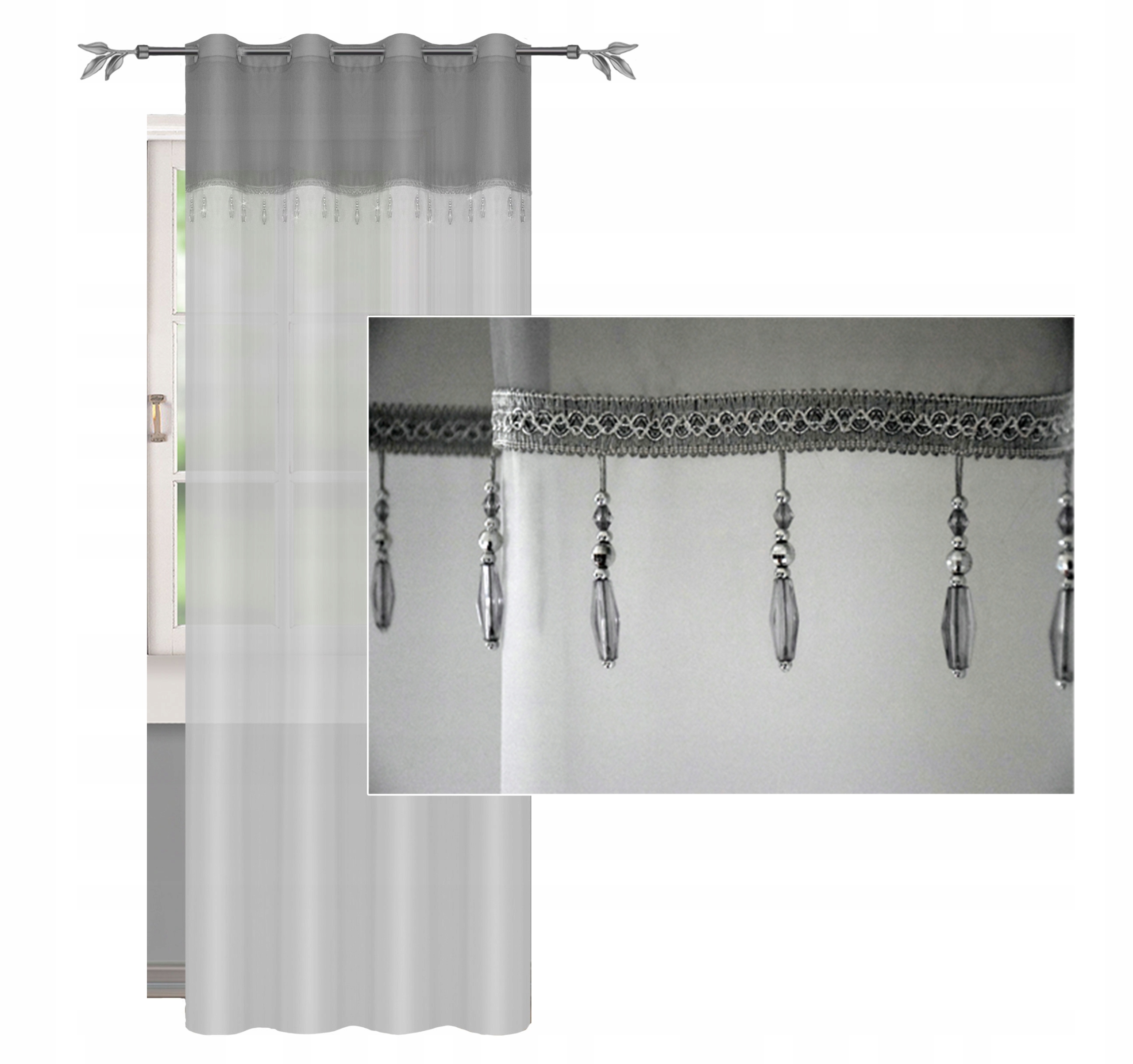 Предметом предложения является готовая повеска ШТОРА из гладкой вуали с декоративной лентой и подвесными акриловыми бусинами GLAMOUR.