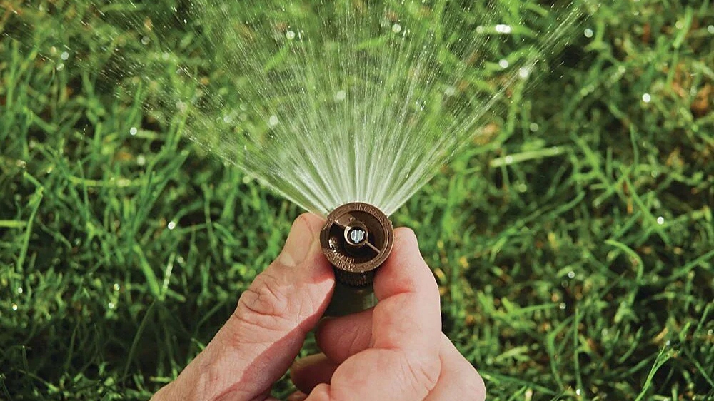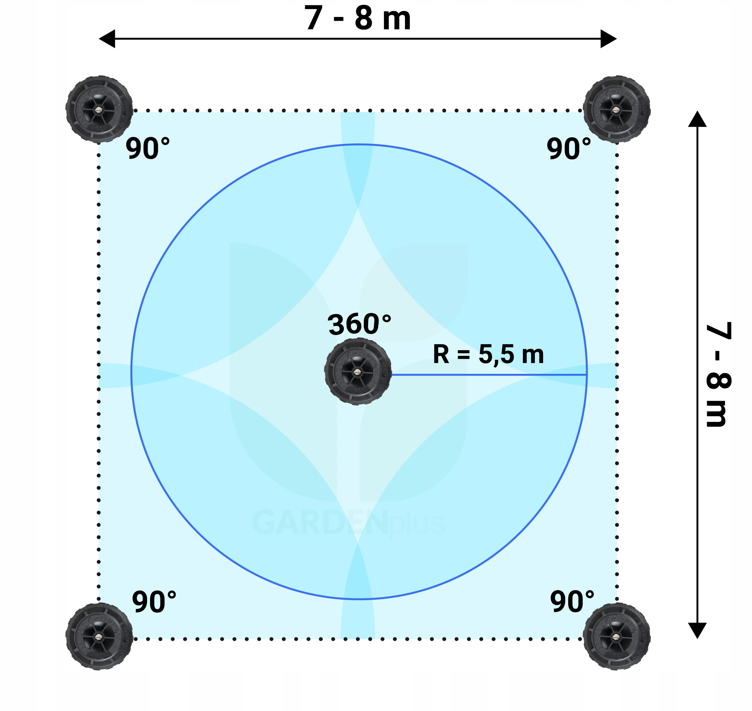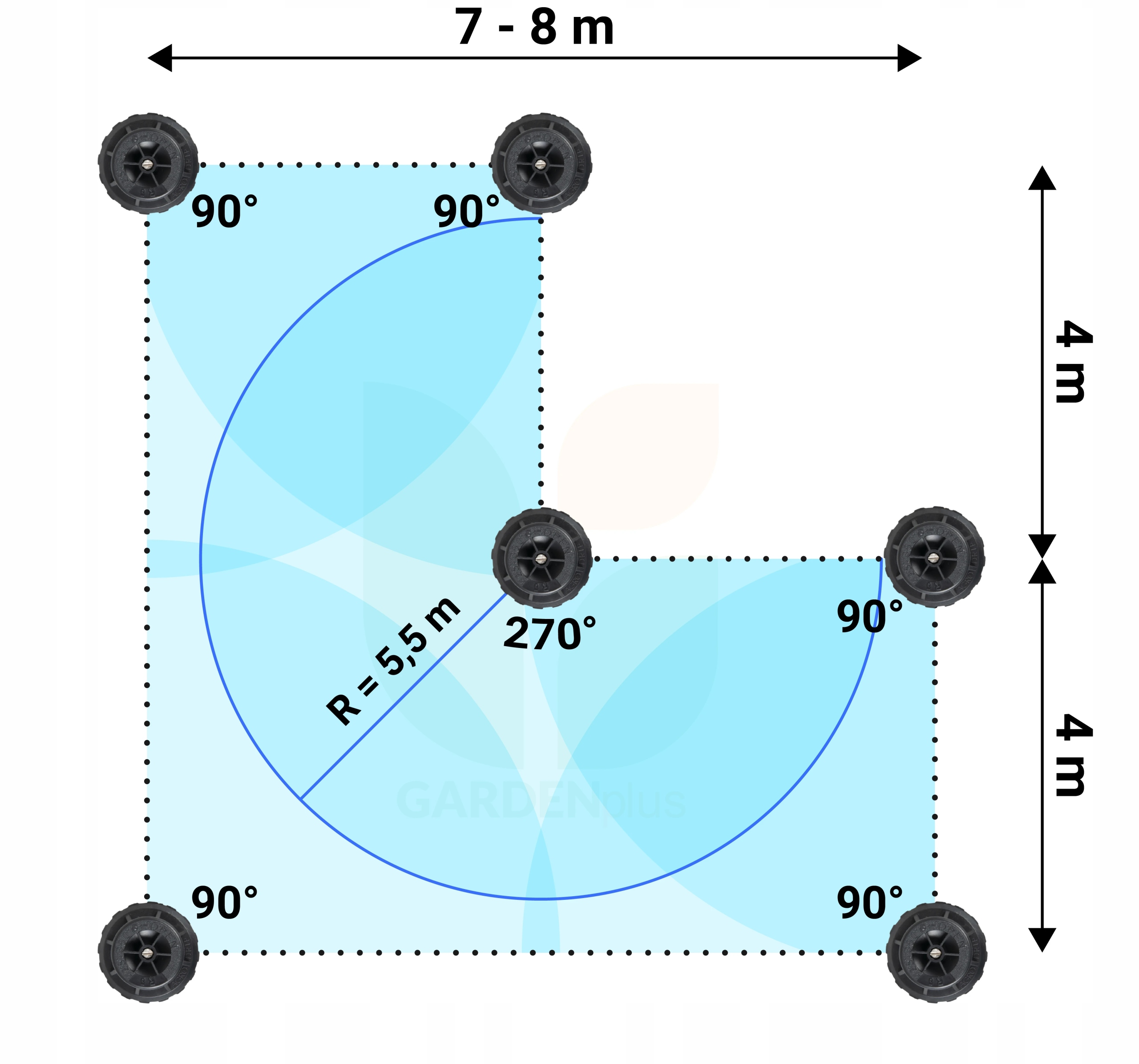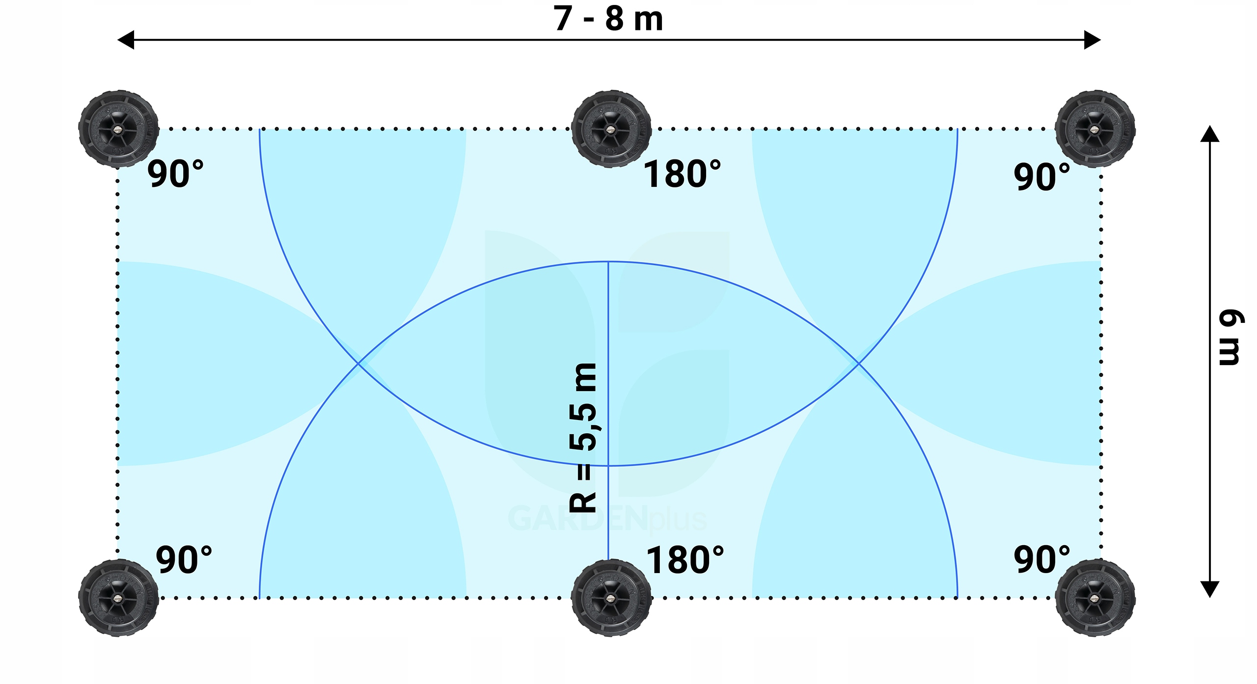 Настроив 4 разбрызгивателя под углом 90° и 2 под углом 180°, мы подготовим для орошения самую распространенную область участка — прямоугольник.