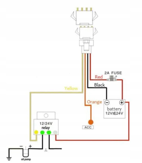 Включенный луч кабеля для подключения без каких-либо преобразователей и т. Д. Вы подключаете красный «+» и черный »-« Мощность мощности красной питания 12-24 В и устанавливаете SIM-карту. Если мы хотим выполнить функции «сигнализации автомобиля», то третий провод (ACC) в Orange подключен к приливе, информирующей о запуске автомобиля (он может быть вообще не подключен или подключен или подключен к радиосвязи или зажиганию). Чтобы отрезать топливо, реле, включенное в набор, к которому мы подключаем желтый кабель (вы также не можете подключить его вообще).