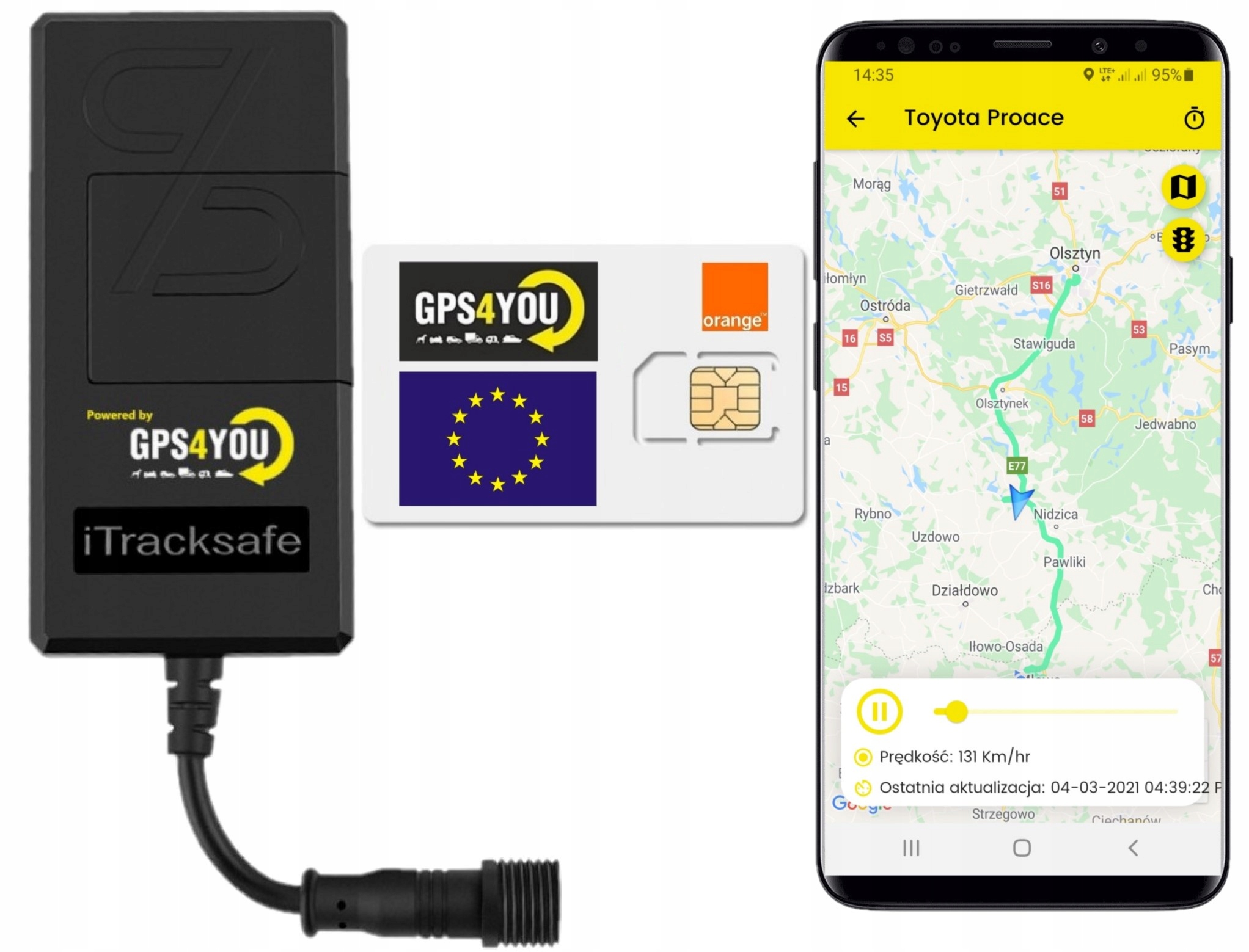 - Доступ к польскому серверу GPS4YOU (доступ к онлайн-мониторингу, отображение положения автомобиля в реальном времени и истории до 3 месяца назад позиция обновляется каждые 10 секунд, вы получаете свой Логин и Пароль от сервера).
