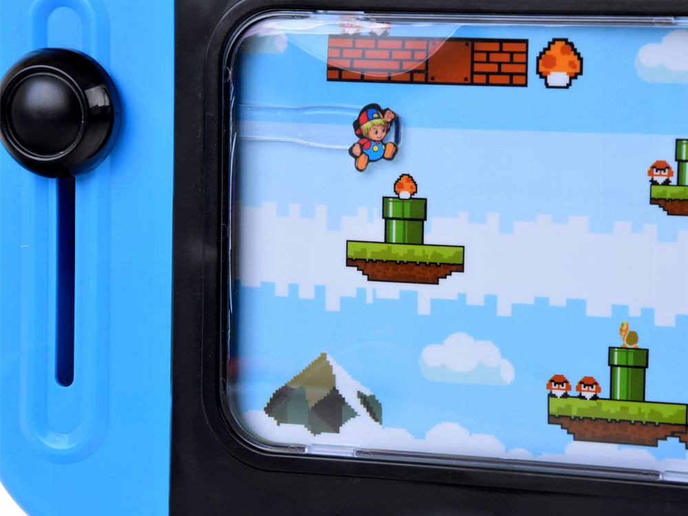 Эта удобная консоль — отличная идея для каждого любителя игр. В него встроена приключенческая игра, в которой маленький герой должен избегать таких препятствий, как дымоходы, грибы или кирпичные стены. После запуска игры кнопкой PLAY графика на ленте начинает двигаться и игрок управляет героем вверх или вниз с помощью бокового ползунка.