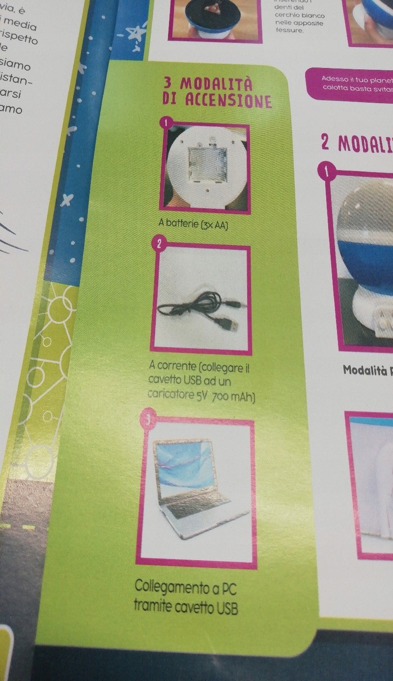 В комплект входит проектор с 3-мя крышками, кабель питания USB, 25 карточек, плакат и инструкция на итальянском языке.
