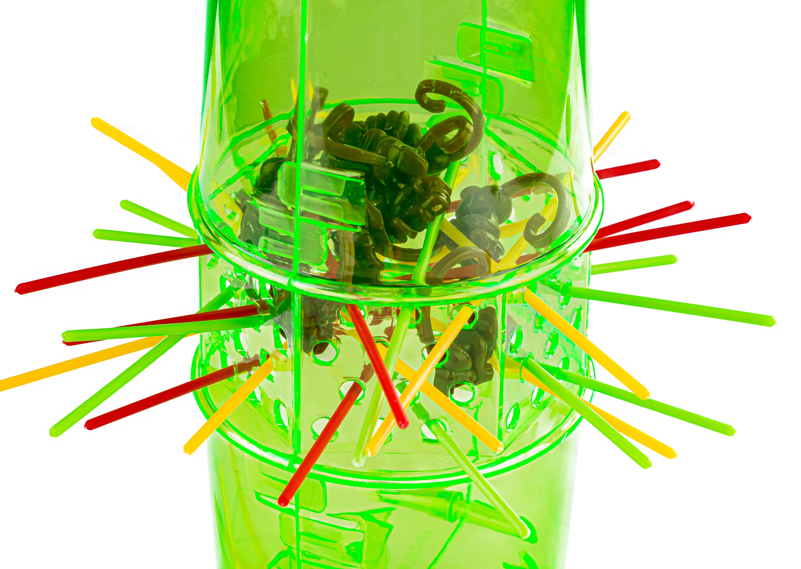 В отверстия нашей башни вставляем веточки - цветные соломинки - по 7 каждого цвета. Сверху кидаем всех обезьян в дыру в башне, чтобы они висели на ветках/кусках. Если какая-то обезьянка упадет на основу, подбираем ее и бросаем сверху, пока все они не висят на ветках. После начала игры каждый игрок по очереди осторожно вытаскивает соломинку любого цвета. Игрок размещает перед собой упавших на дно обезьян. В конце игры мы считаем наших приматов. Победителем становится тот, кто сбил с башни наименьшее количество обезьян.