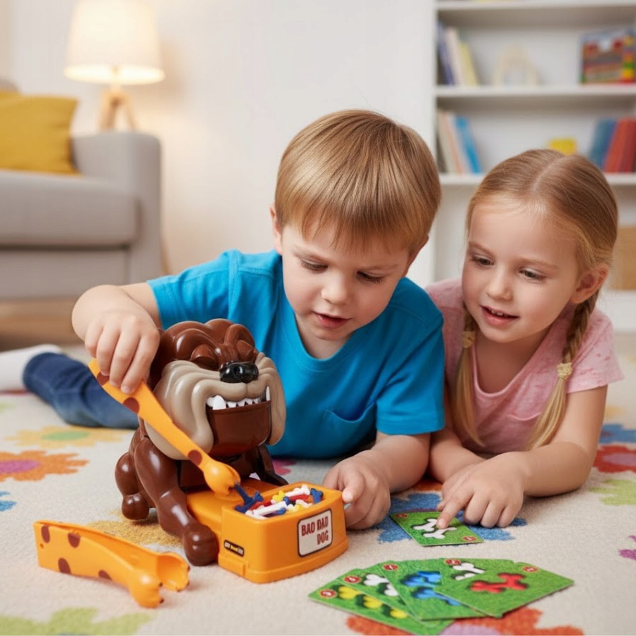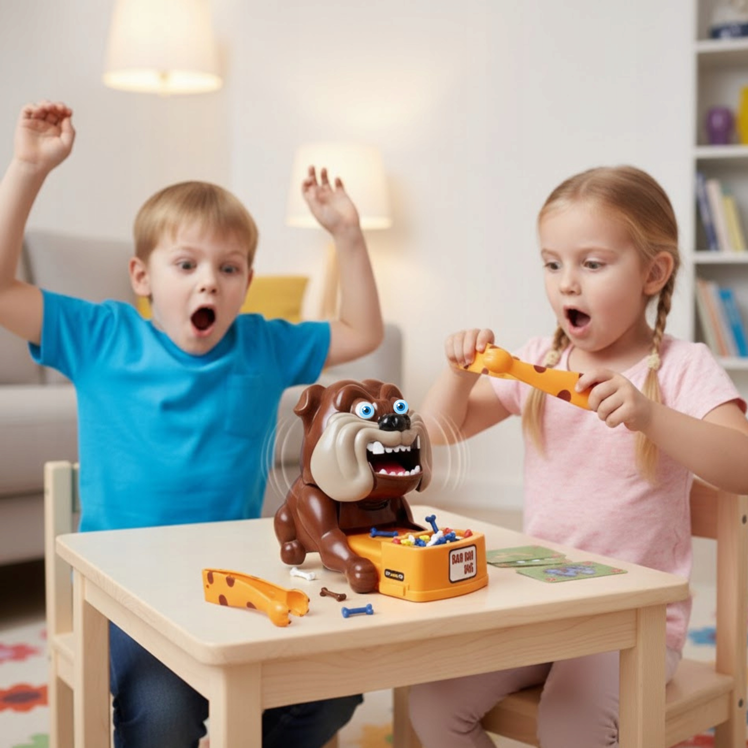 Игроки по очереди вытягивают карту и с помощью захвата пытаются вытащить из миски собаки соответствующее количество кубиков цвета, указанного на карте.