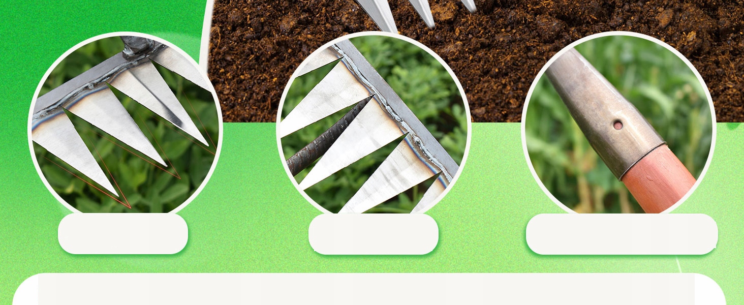 ПРОЧНОЕ КАЧЕСТВО: Садовые инструменты изготовлены из высококачественной стали, сварены вручную и очень долговечны. Грабли садовые имеют тройную приварку в местах соединения стальных зубьев, что обеспечивает большую устойчивость и долговечность зубьев головки, предотвращая выпадение головки.