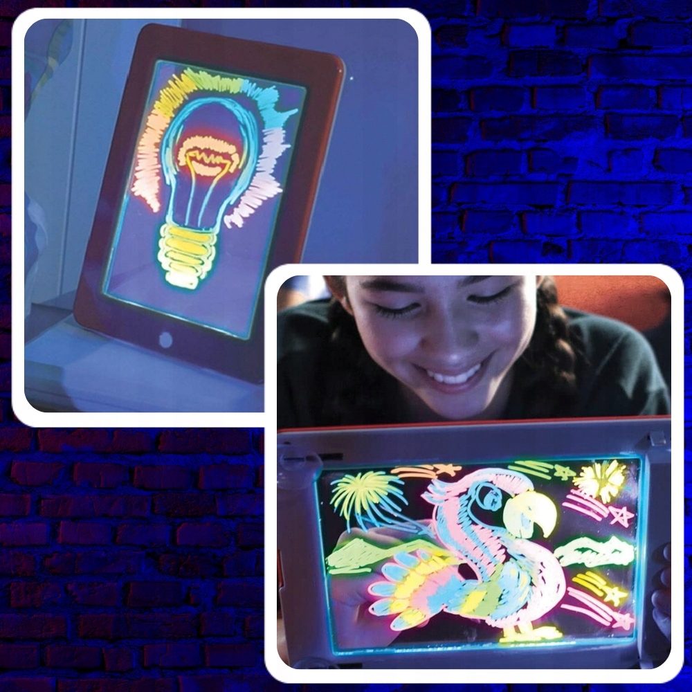 Дополнительным преимуществом волшебного планшета является светодиодная подсветка, которая подчеркивает привлекательность рисунков и позволяет им отлично смотреться в темных помещениях. На задней панели планшета имеется подставка, благодаря которой его можно разместить как фоторамку и выводить на экран рисунки.