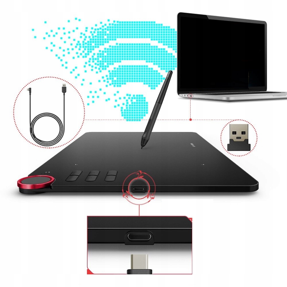 - Аксессуары8 запасных картриджей, кабель USB-C, перо, подставка для пера, перчатки для графического планшета