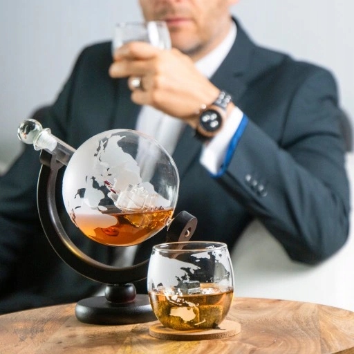 Наш элегантный набор для виски «Глобус» — это квинтэссенция роскоши и стиля, подчеркнутая мельчайшими деталями. Он состоит из графина, двух стаканов, каменных кубиков и пробковых подставок. Каждый элемент набора изготовлен из материалов высочайшего качества, обеспечивающих долговечность и надежность.
