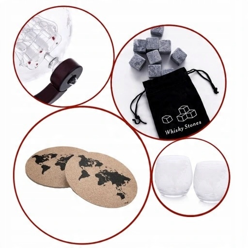 Композиция также включает в себя два великолепных бокала для виски, каменные кубики для напитков и пробковые подставки, что делает ее идеальным набором для любого любителя виски.