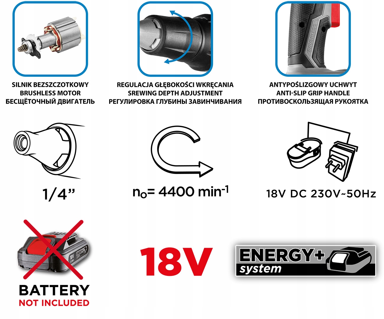 Оперативная энергия графита+ 18 В 58GE111 Отвертка аккумулятора -это энергия+ отвертка с бесщеточным двигателем, функционирующим в системе батареи. Рекомендуемая батарея с емкостью 4 часа А.ч., где рабочее время 2 AH составляет около 43 минут. Отвертка достигает 4400 об / мин, а ее максимальный крутящий момент составляет 7 Нм. Оснащенный ¼ "шестигранником и регулировкой глубины винта влияет на комфорт выполняемых задач. Инструмент имеет функцию подсветки и непрерывной работы.
