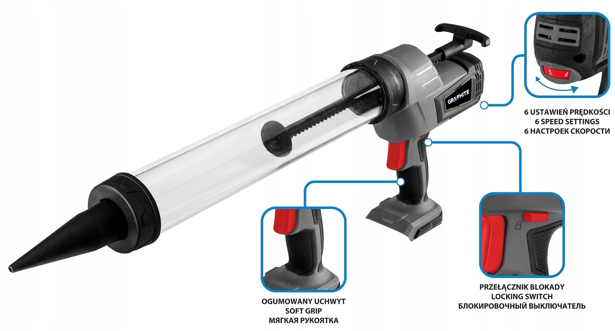 Пистолет для герметизации имеет целых 6 настроек скорости, позволяющих подобрать индивидуальные параметры под тип выполняемых работ. Резиновая, нескользящая ручка и блокировка от случайного нажатия на корпус - дополнительно повышают комфорт использования.