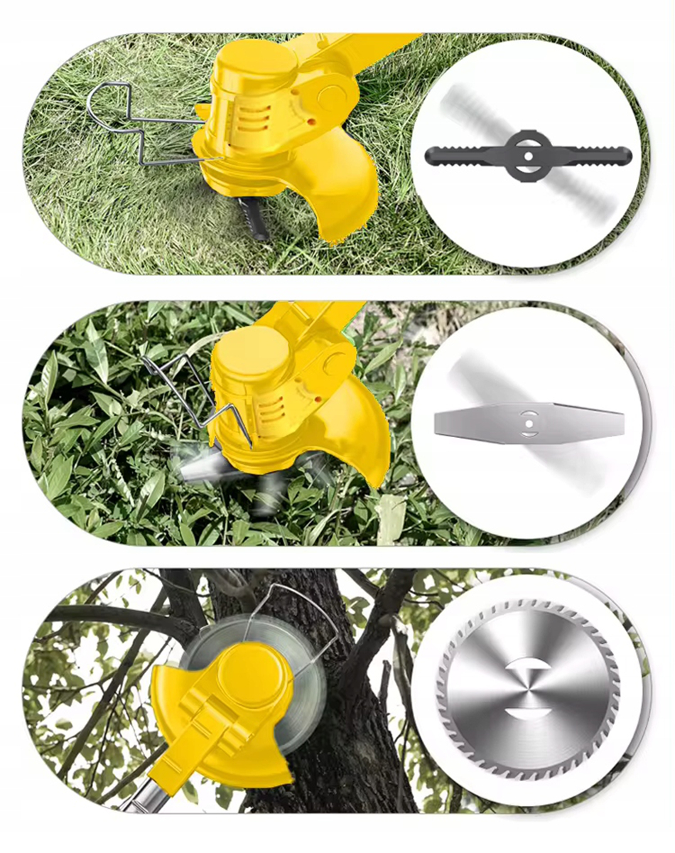 Электрический чемодан батареи с 3 типами лопастей, линия рыбалки для аккумулятора для обрезки мягких сорняков и режущих кромков, лопасть Matel может удалять сорняки и живые жидкости, металлическая пилочная лезвия может разрезать кустарники и толстые стволы деревьев. Сорняки подходят для газона, сада, различных сценариев.
