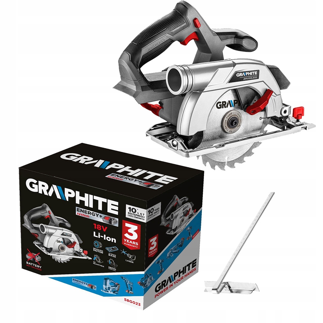 Пила циркулярная бесщеточная Energy+ 18V ГРАФИТ 58G023Эффективный электроинструмент с диском внешним диаметром 165 мм, предназначенный для распиловки древесины и других древесных материалов. В комплект пил входит параллельная направляющая для точных продольных пропилов. Пила проста и удобна в использовании.Регулировка угла и глубины резания осуществляется без инструментов, в настройке параметров помогают специальные шкалы.