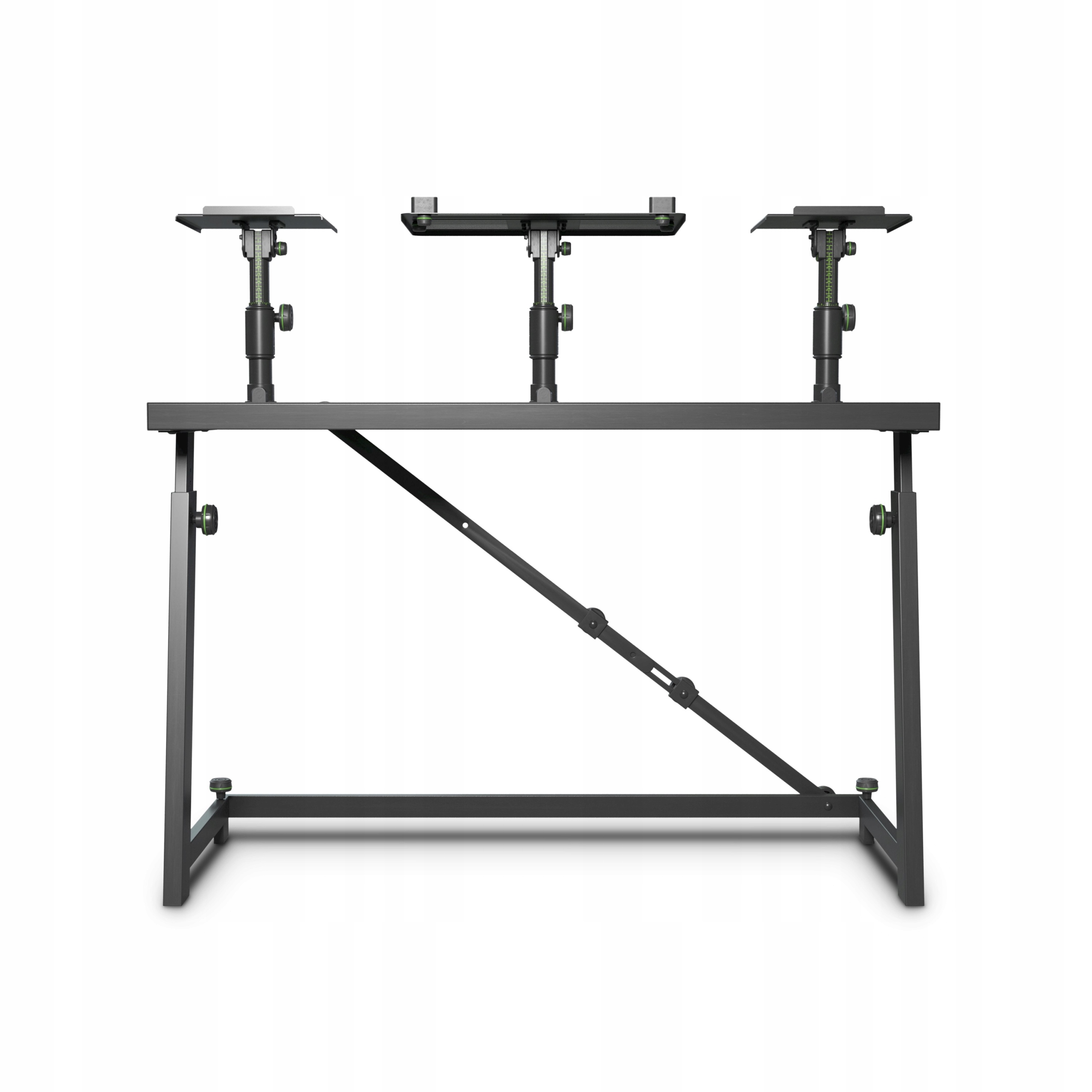 Сердцем вашего оборудования, в центре стола, является ваш ноутбук. Он надежно удерживается встроенными штифтами, поэтому даже при крайнем наклоне он всегда в безопасности. Подставки для колонок и ноутбука можно точно расположить вдоль задней направляющей Gravity® FDJT 01 DJ, сдвинув их влево или вправо.
