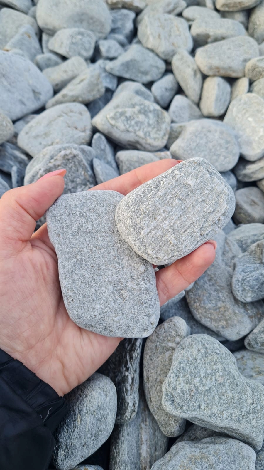 Рыбная галька — натуральный камень оттенков серого. В сухом состоянии его цвет становится серым, во влажном — графитовым. Он универсален, хорошо гармонирует как с зеленью садовых растений, так и с сырой промышленной средой.