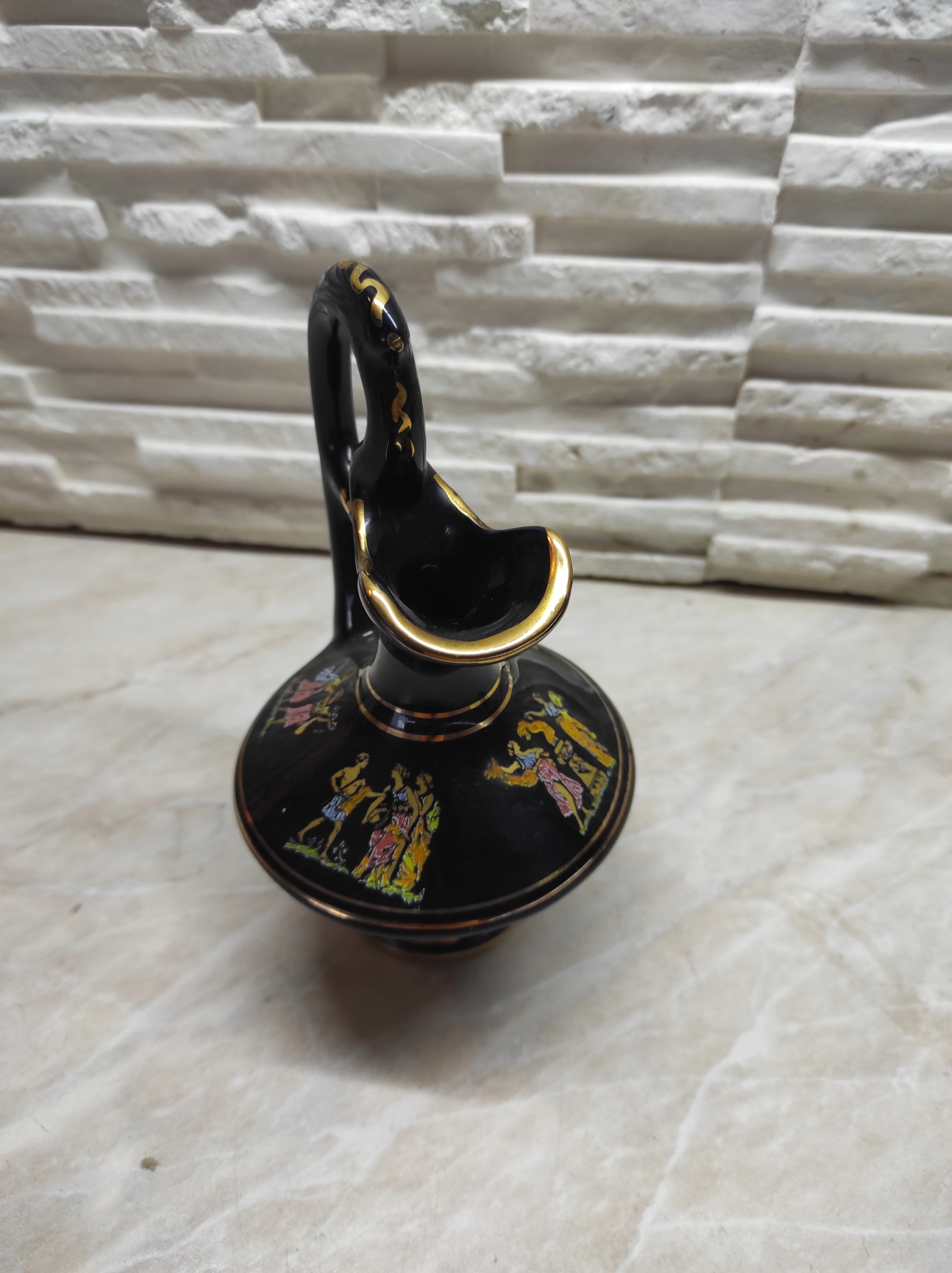 Небольшой черно-золотой винтажный кувшин с древнегреческим узором. Изготовлено компанией Neofitou Keramik в Греции из черной глазурованной керамики с узором из 24-каратного золота. Примерно 1960 г.