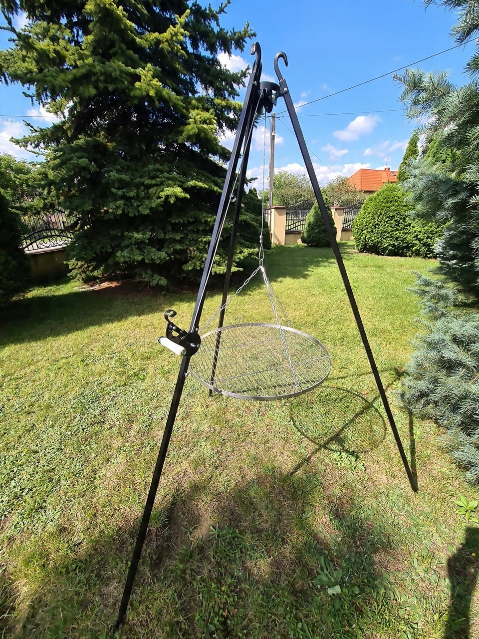 Штатив оснащен катушкой для регулировки высоты решетки, веревкой, оцинкованными цепями и карабинами для подвешивания решетки. решетка, в комплект также входит решетка из нержавеющей стали.