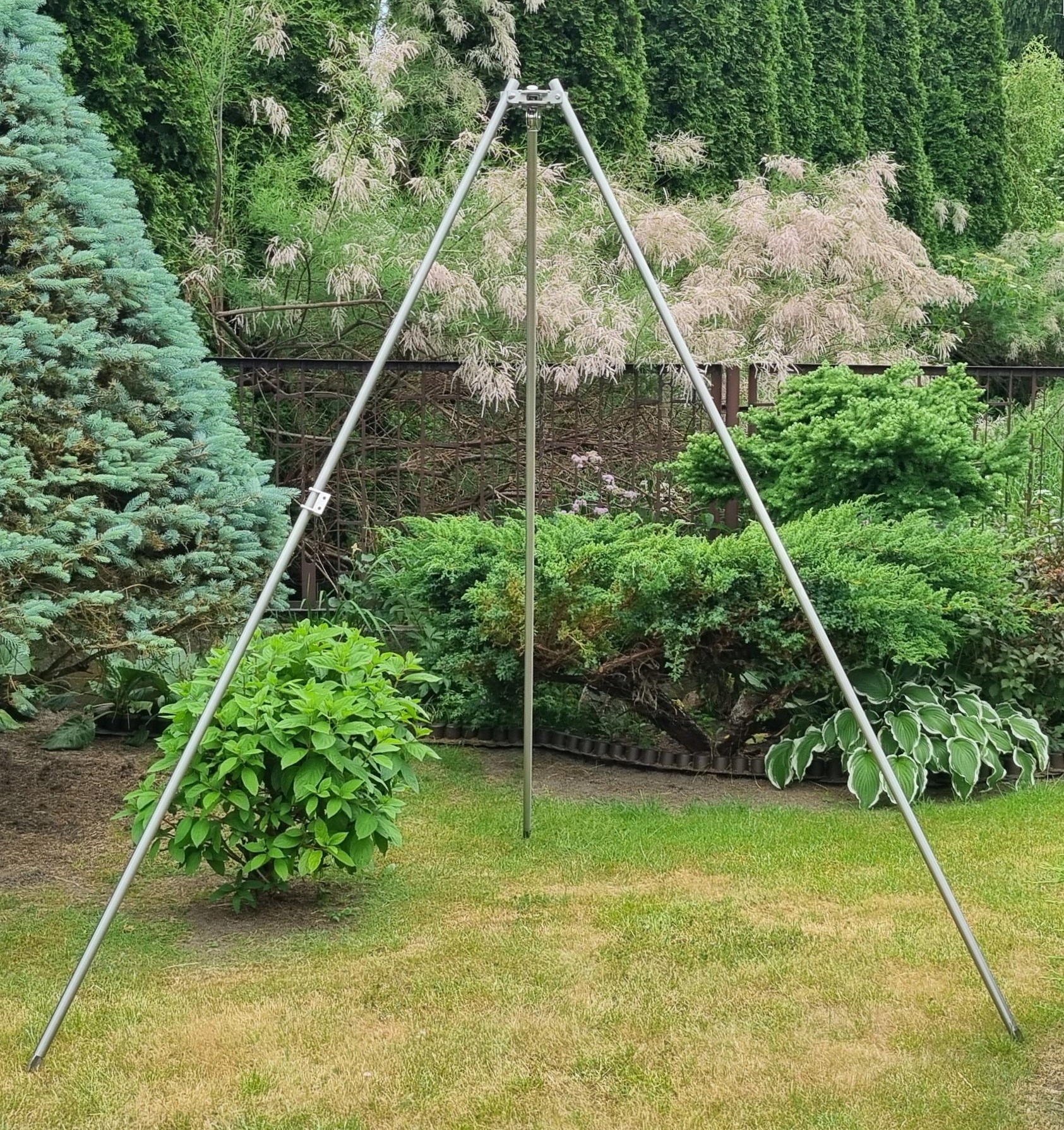 Высокая и сильная конструкция треугольника и большего расстояния между ногами гарантирует свободу при жарке даже с большим диаметром огня или очага