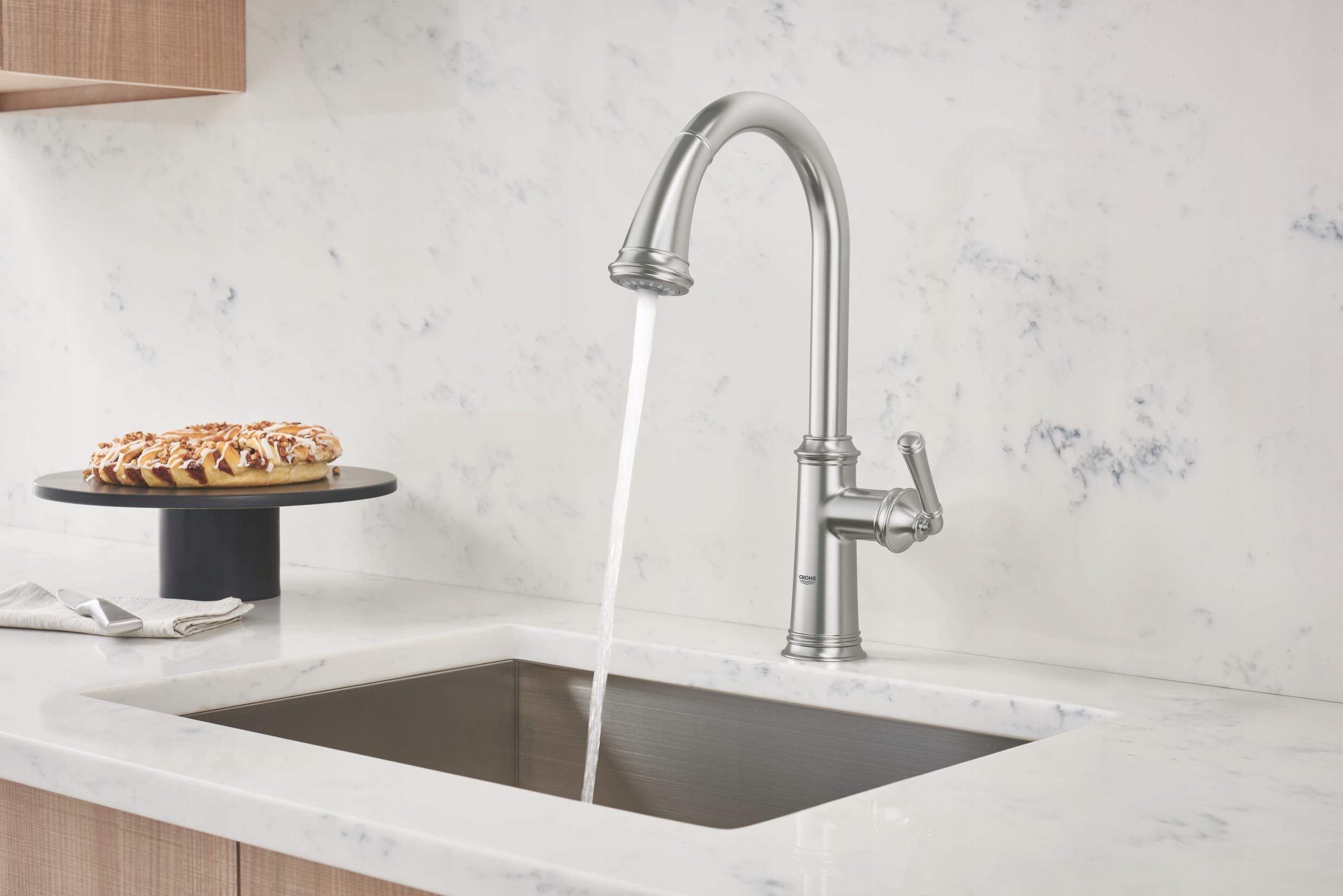 - Компоненты в комплекте: Grohe Gloucester | Смеситель для кухни с выдвижным изливом для душа | Gloucester, вращающийся на 360°, высокий излив С-образной формы, Supersteel | 30422DC0