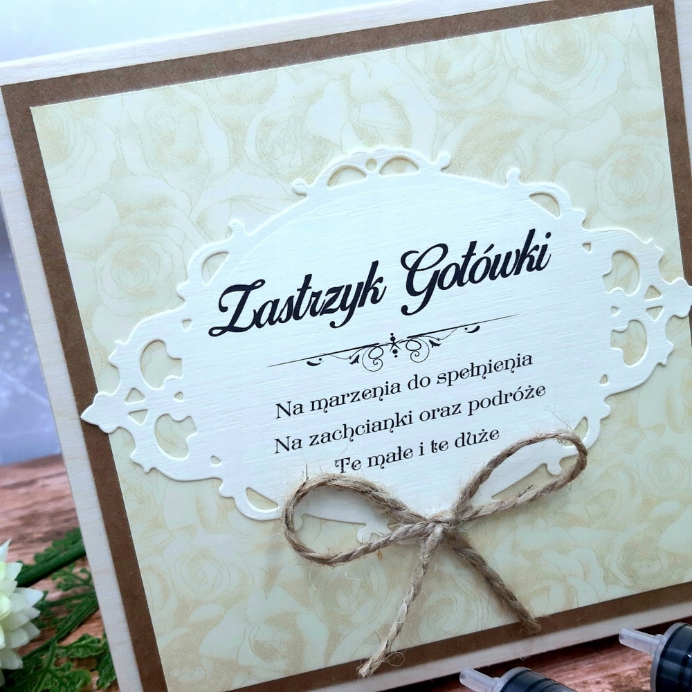 Ящик из светлого соснового дерева с 5 шприцами, в которые закатываем и кладем определенную сумму. Внутри пожелания - 35 стихотворений на выбор.
