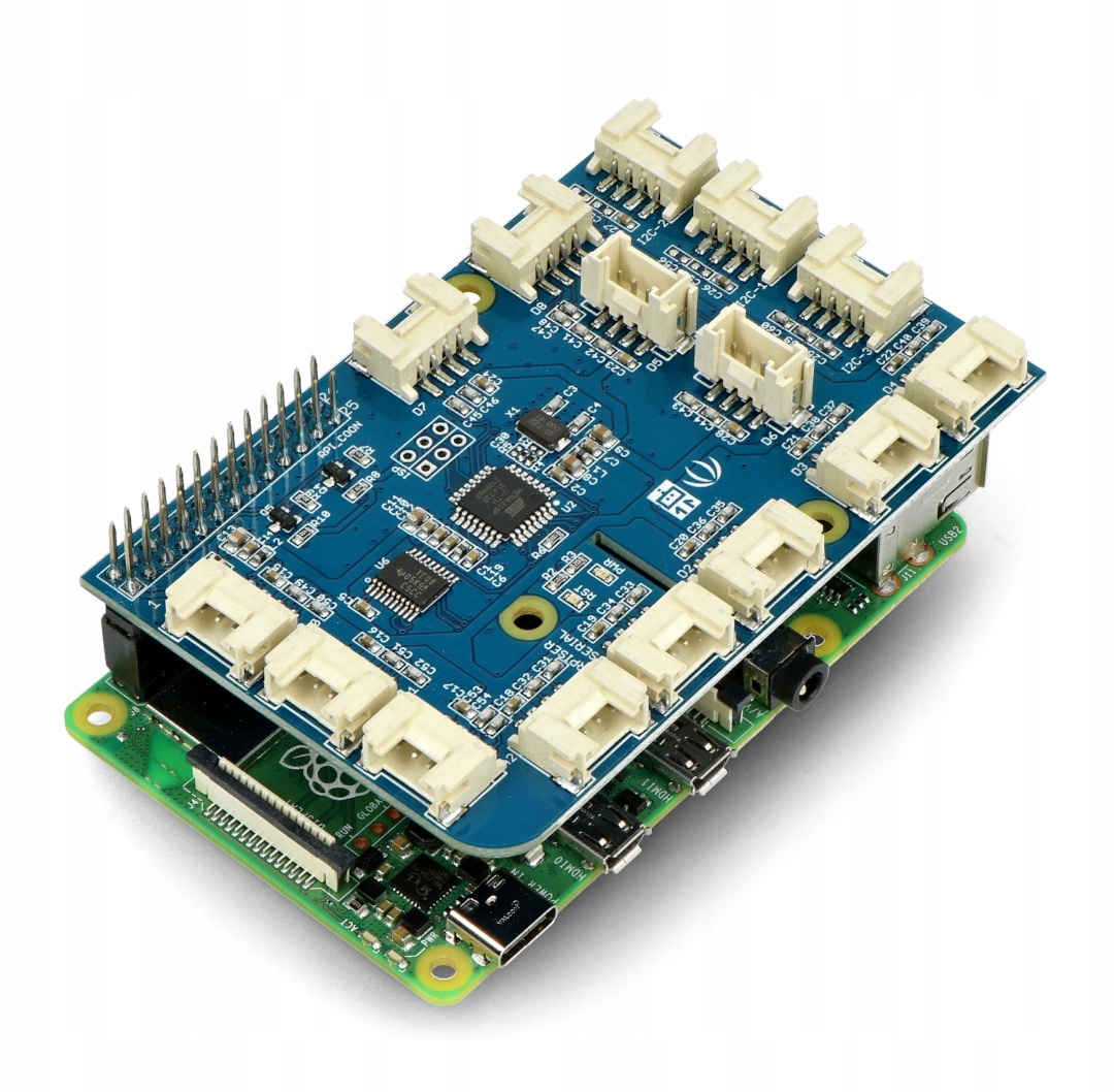 Шилд для Raspberry Pi, оснащенный 15 4-контактными разъемами, позволяющими подключать датчики серии Grove к мини-компьютеру. Работает с более чем сотней модулей.