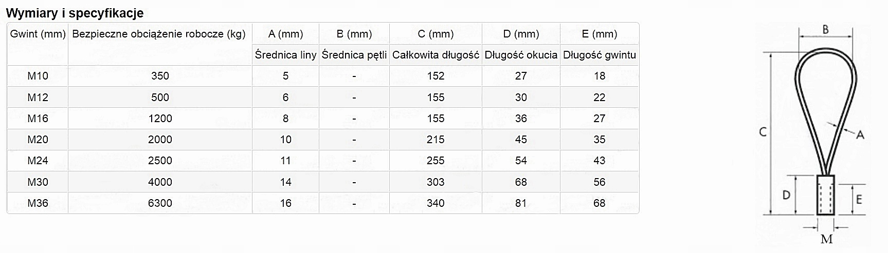 ИСПОЛНЕНИЕ: Веревочная петля с резьбой для подъема только в поперечном направлении до 45 градусов, изготовлена из стальных тросов, плотно зажатых в соединителе с внешней резьбой в соответствии с ISO/DIN. стандартно изготавливаются в метрическом исполнении или в метрической стальной втулке с круглой резьбой /тип RD/. При креплении он входит в постоянно вставленное в сборный элемент стальное анкерное гнездо той же формы и размера резьбы. Доступно в версиях DOR: 0,35 - 6,3 тонны с метрической резьбой М10 - М36.